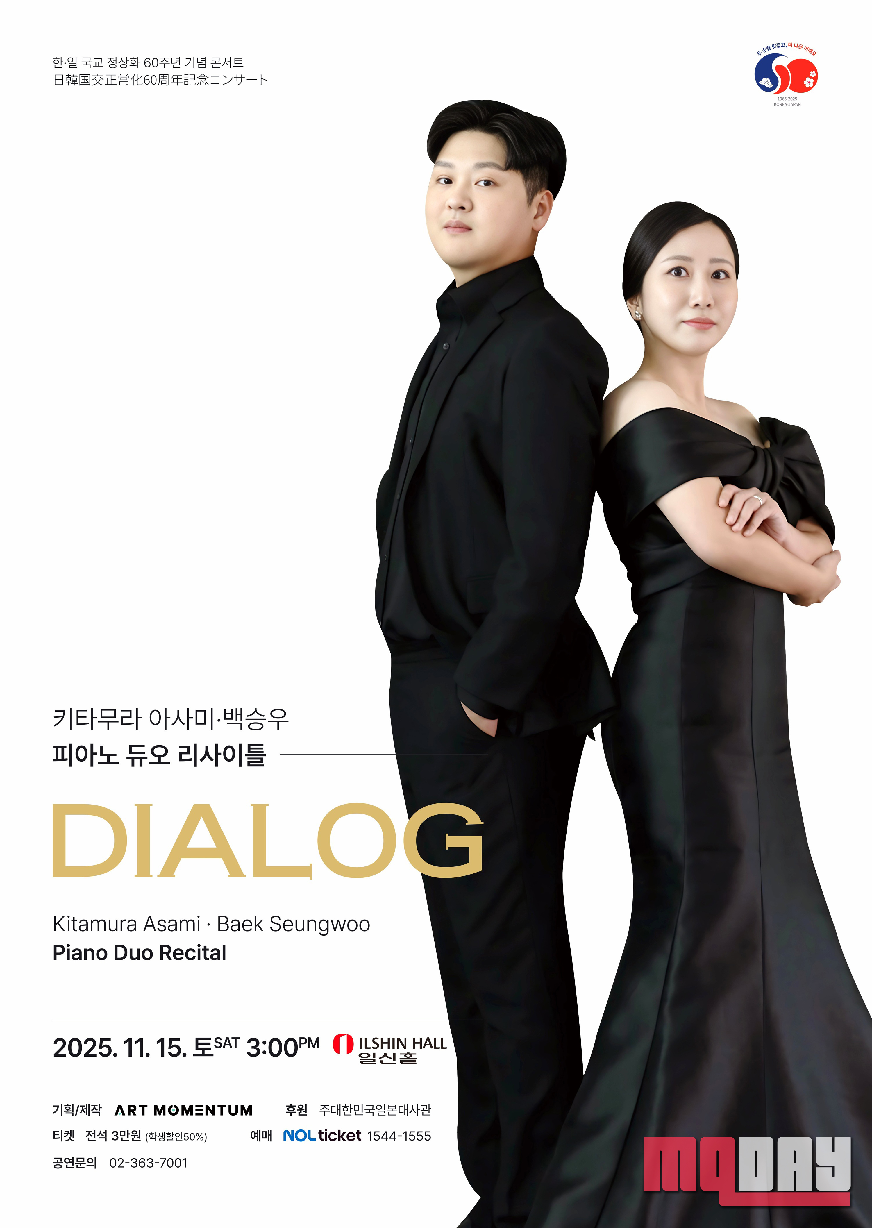 한일 국교정상화 60주년을 기념하는 듀오 리사이틀 ‘Dialog’가 오는 11월15일(토) 오후 3시 서울 일신홀에서 열린다. 이번 공연에서는 일본 피아니스트 키타무라 아사미와 한국 피아니스트 백승우가 처음으로 함께 무대에 올라 특별한 음악적 순간을 선사한다.