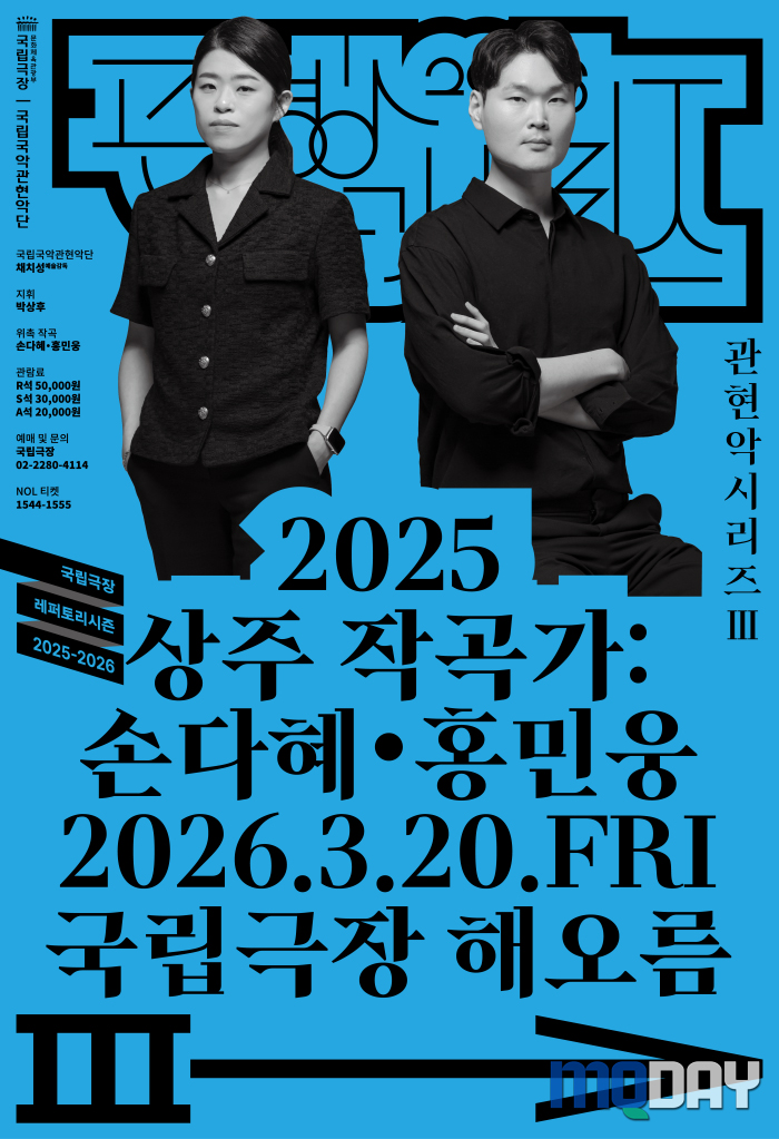 국립극장(극장장 박인건) 전속단체 국립국악관현악단(예술감독 겸 단장 채치성)은 관현악시리즈Ⅲ ‘2025 상주 작곡가: 손다혜·홍민웅’(이하 ‘2025 상주 작곡가’)을 3월20일(금) 해오름극장에서 공연한다.