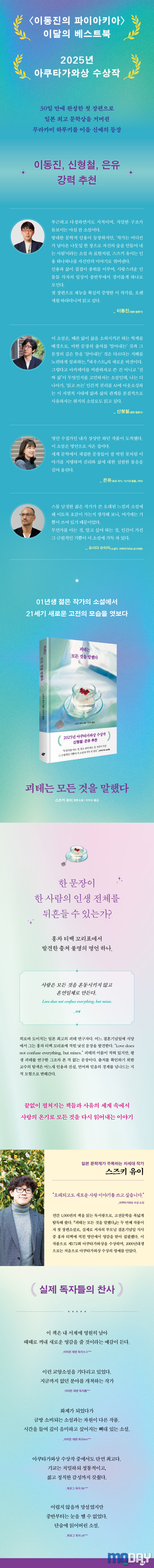 2025년, 일본 문단은 한 20대 대학원생의 등장에 발칵 뒤집혔다. 그의 이름은 ‘스즈키 유이’ 첫 장편소설 ‘쾨테는 모든 것을 말했다’로 제 172회 아쿠타가와상을 거머쥔 그는, 일본 문학계에서 ‘2000년대생 최초의 수상자’이자 ‘움베르토 에코나 이탈로 칼비노의 재래’라는 엄청난 수식어를 달고 화려하게 데뷔했다.