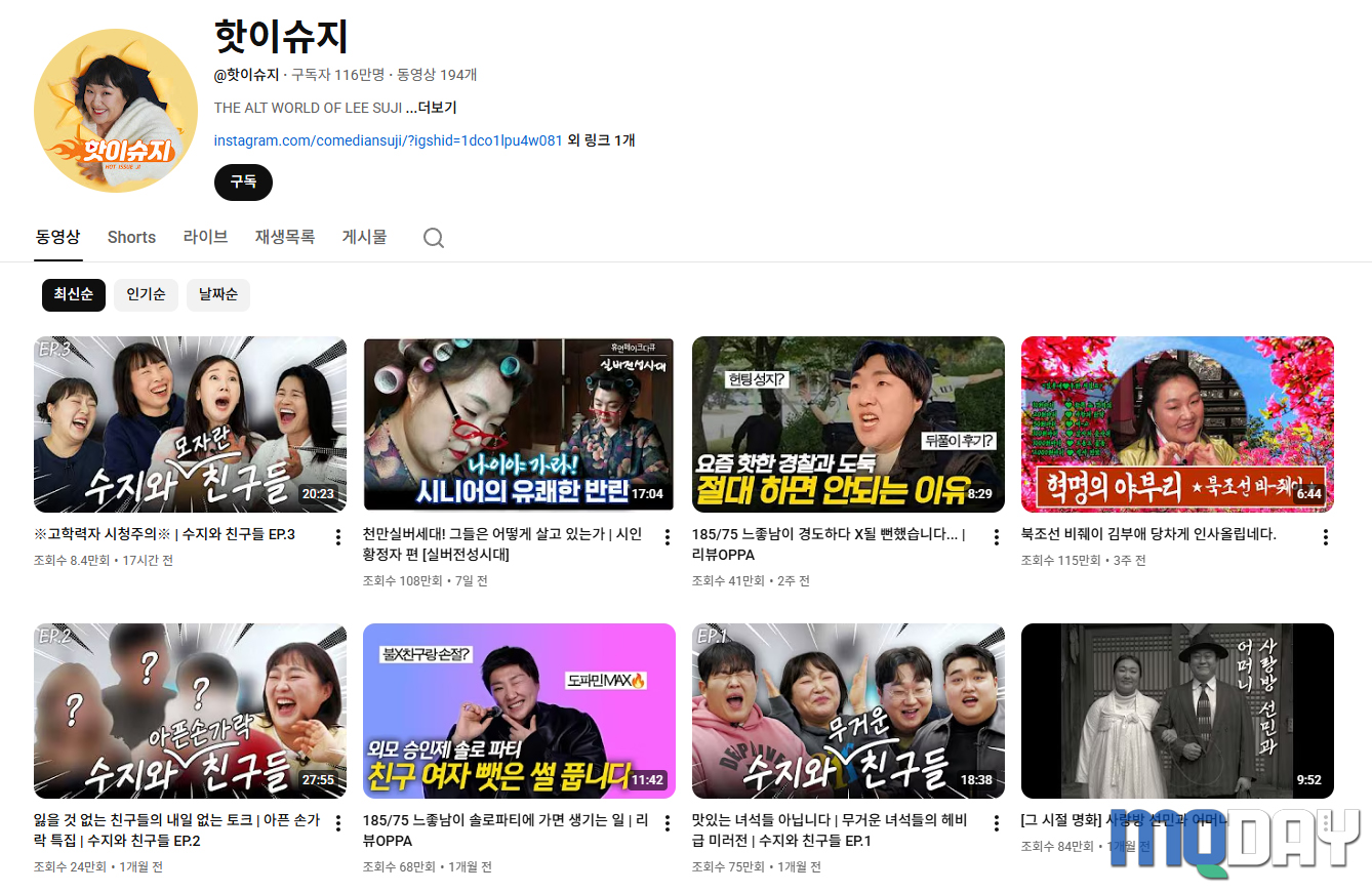개그우먼 이수지가 운영하는 유튜브 채널 핫이슈지는 뛰어난 관찰력을 바탕으로 한 하이퍼 리얼리즘 다큐멘터리를 선보이며 큰 인기를 끌고 있다. 2024년 말 개설 이후 단기간에 폭발적인 구독자 증가를 기록하며 유튜브 코미디 생태계에 새로운 트렌드를 제시하고 있다.
