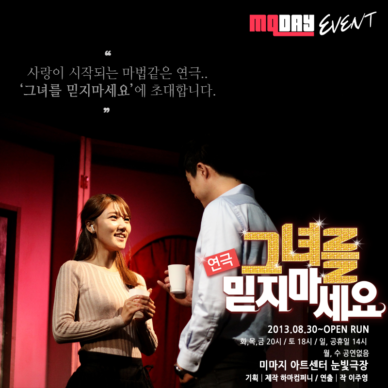 이때, #그녀를믿지마세요 #대학로 #연극 #엠큐데이 의 해시태그를 삽입하면 이벤트 응모가 완료됩니다.