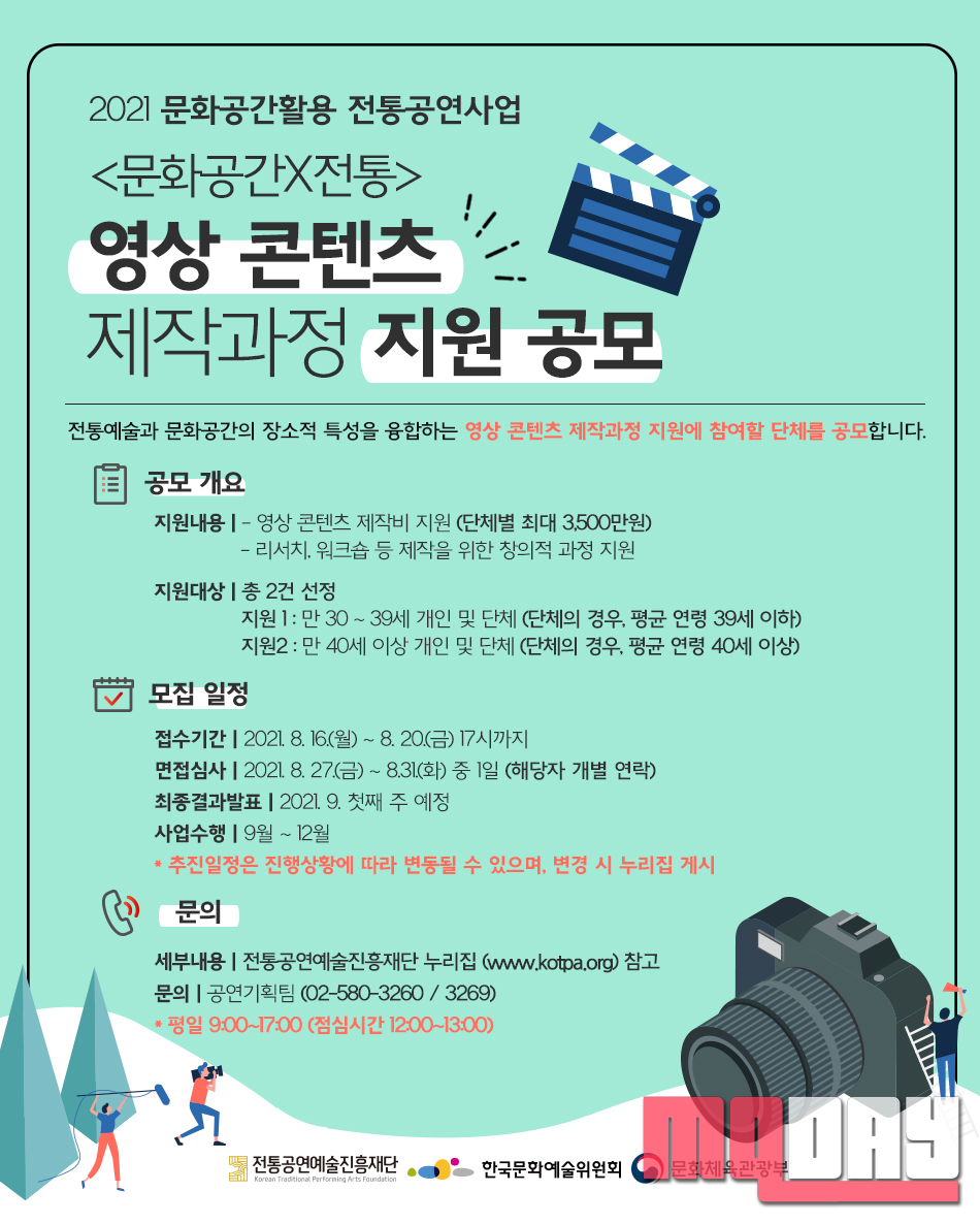 전통공연예술진흥재단(이사장 정성숙)은 대면 공연의 불확실성이 높아진 전통예술 민간단체의 지속 가능한 예술활동을 지원하기 위한 영상 콘텐츠 제작과정 지원 공모 접수를 8월 16일(월)부터 8월 20일(금)까지 진행한다.