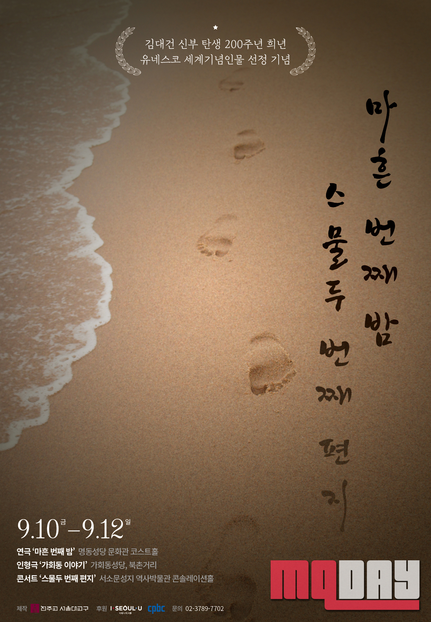 김대건 신부 탄생 200주년과 유네스코 세계기념인물 선정을 맞아 천주교 서울대교구(염수정 추기경)와 서울가톨릭연극협회(최주봉 회장)가 거리극 ‘마흔 번째 밤, 스물두 번째 편지’(연출 유환민, 극본 정영훈·조한건, 음악 최호영), 창작 뮤지컬 ‘우리 벗아’(극본 박경희, 작곡 김성진·김은찬, 연출 민복기) 기념행사를 9·10월 선보인다.