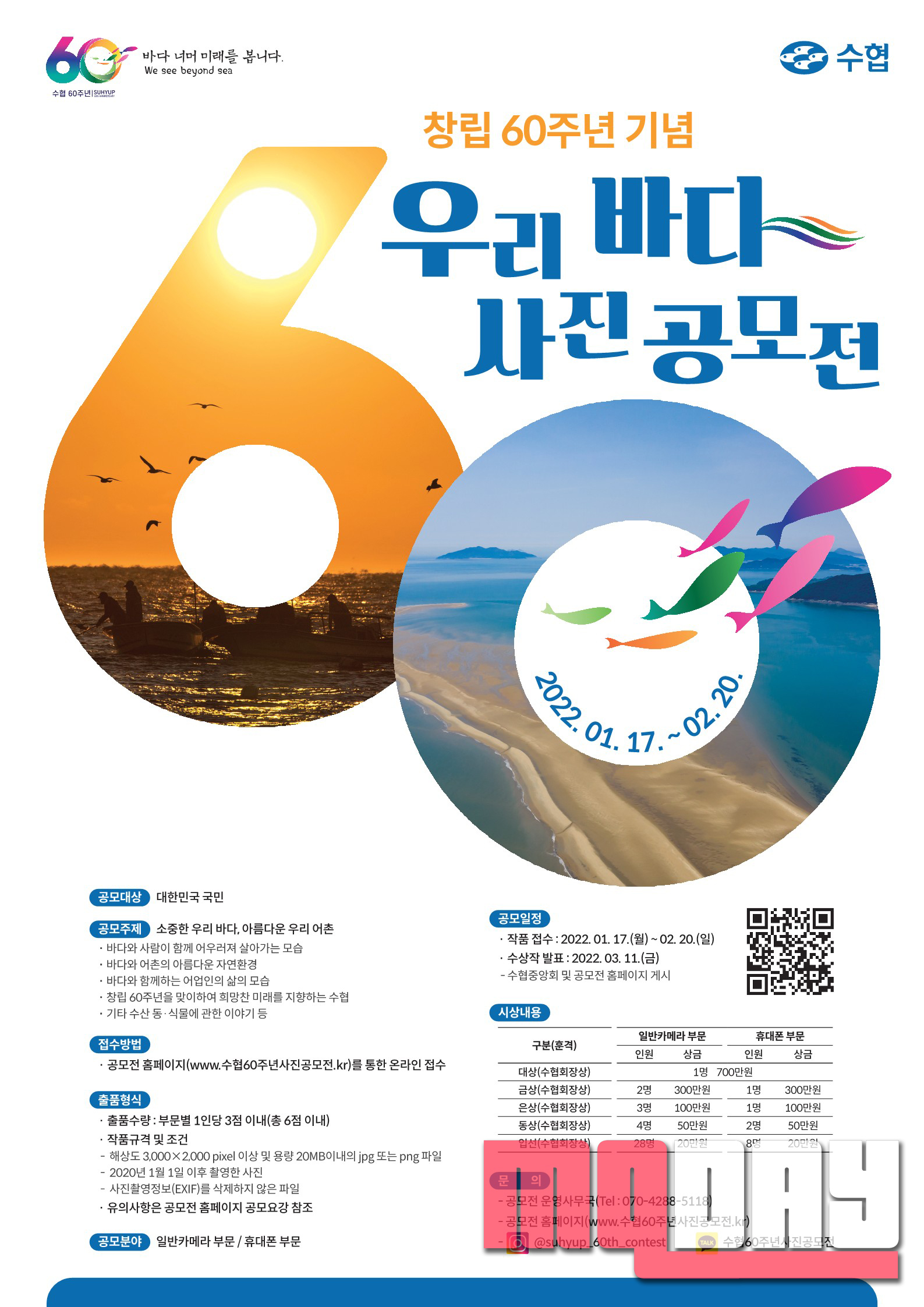 수협중앙회는 창립 60주년을 기념해 바다·어촌의 아름다움을 담은 사진을 공모하는 ‘우리 바다 사진 공모전’을 개최한다.