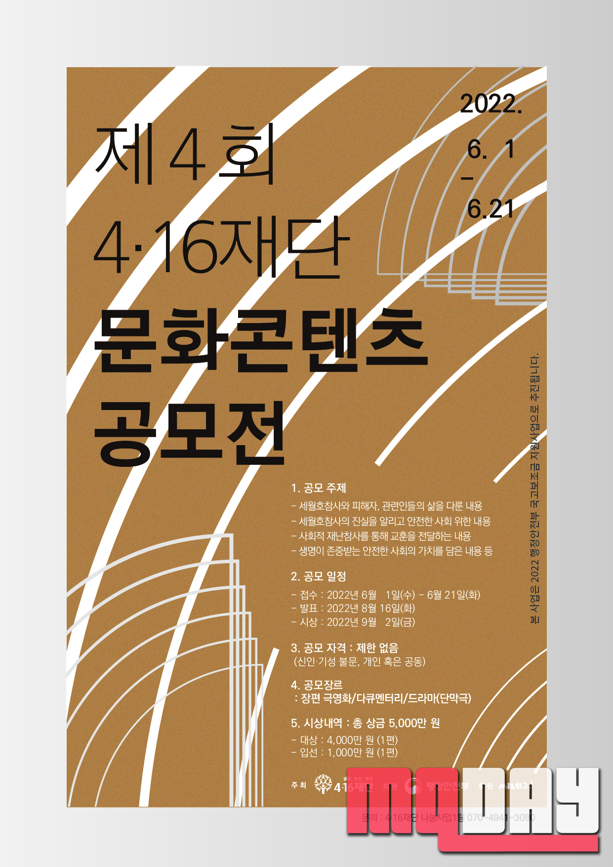 이번 공모전은 행정안전부 국고 보조금 지원 사업으로 진행되며, 4·16재단이 주최하고 씨네21이 함께한다. 공모 대상 콘텐츠는 장편 극영화, 다큐멘터리, 단막극 드라마다.
