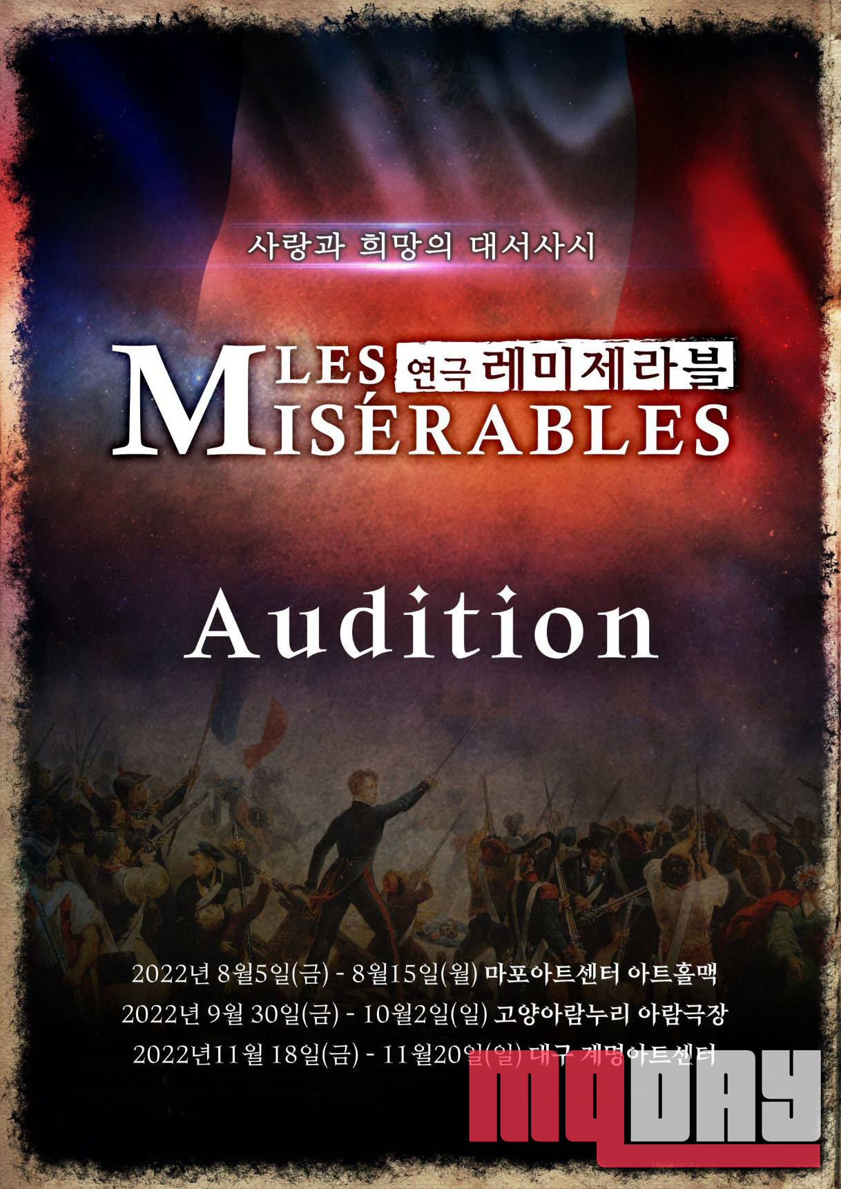 2020년 예술의전당 CJ토월극장에서 열린 공연 오디션에 1400여명의 지원자가 몰려 화제가 됐던 극단 로얄씨어터(예술감독 윤여성)의 연극 ‘레미제라블’이 올해 8월 5~15일 서울 마포아트센터 아트홀맥에서 진행되는 공연의 오디션을 진행한다.