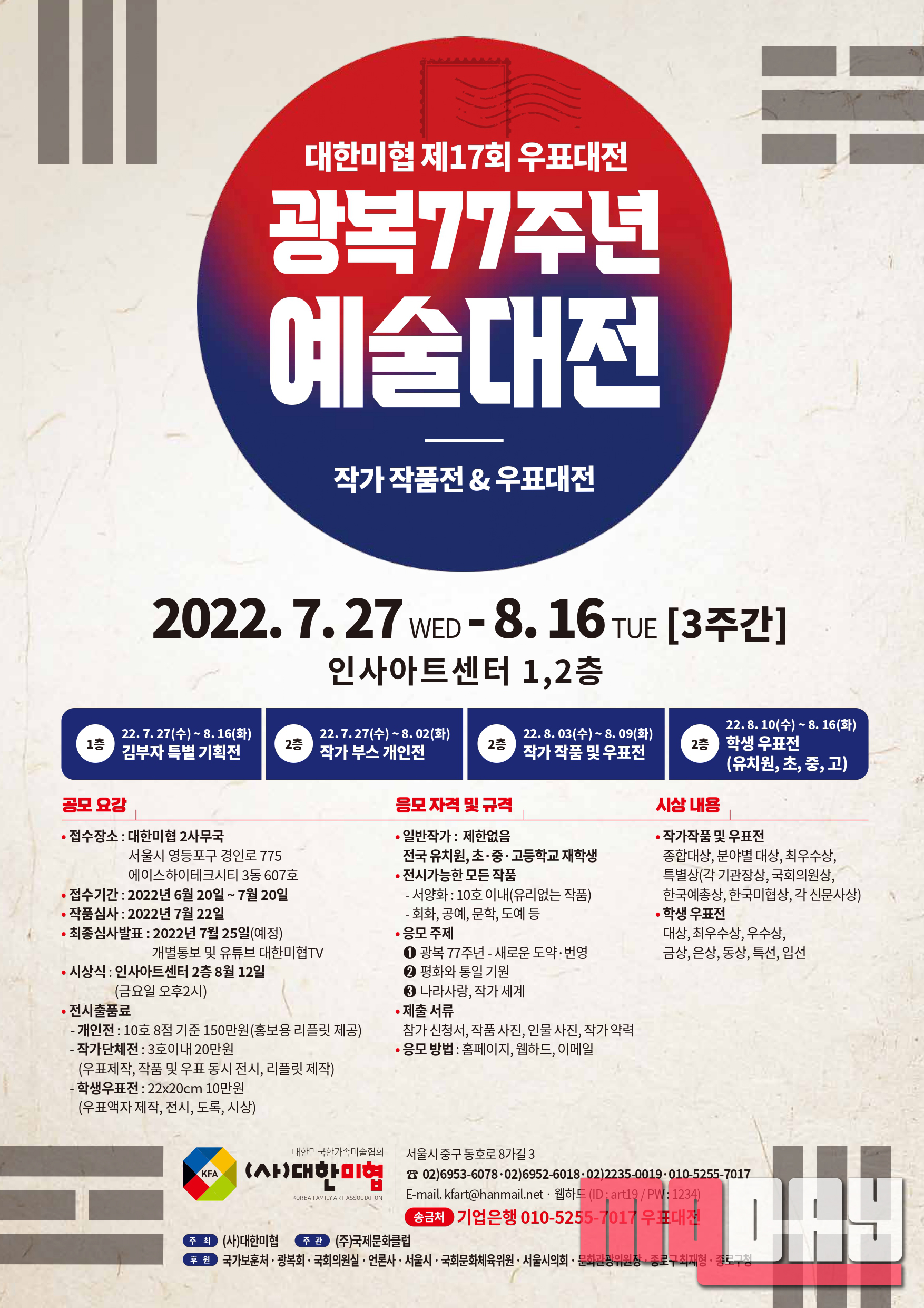 광복 77주년을 맞아 사단법인 대한민국한가족미술협회가 주최하고, 국제문화클럽이 주관하는 학생 우표대전과 예술대전이 열린다.