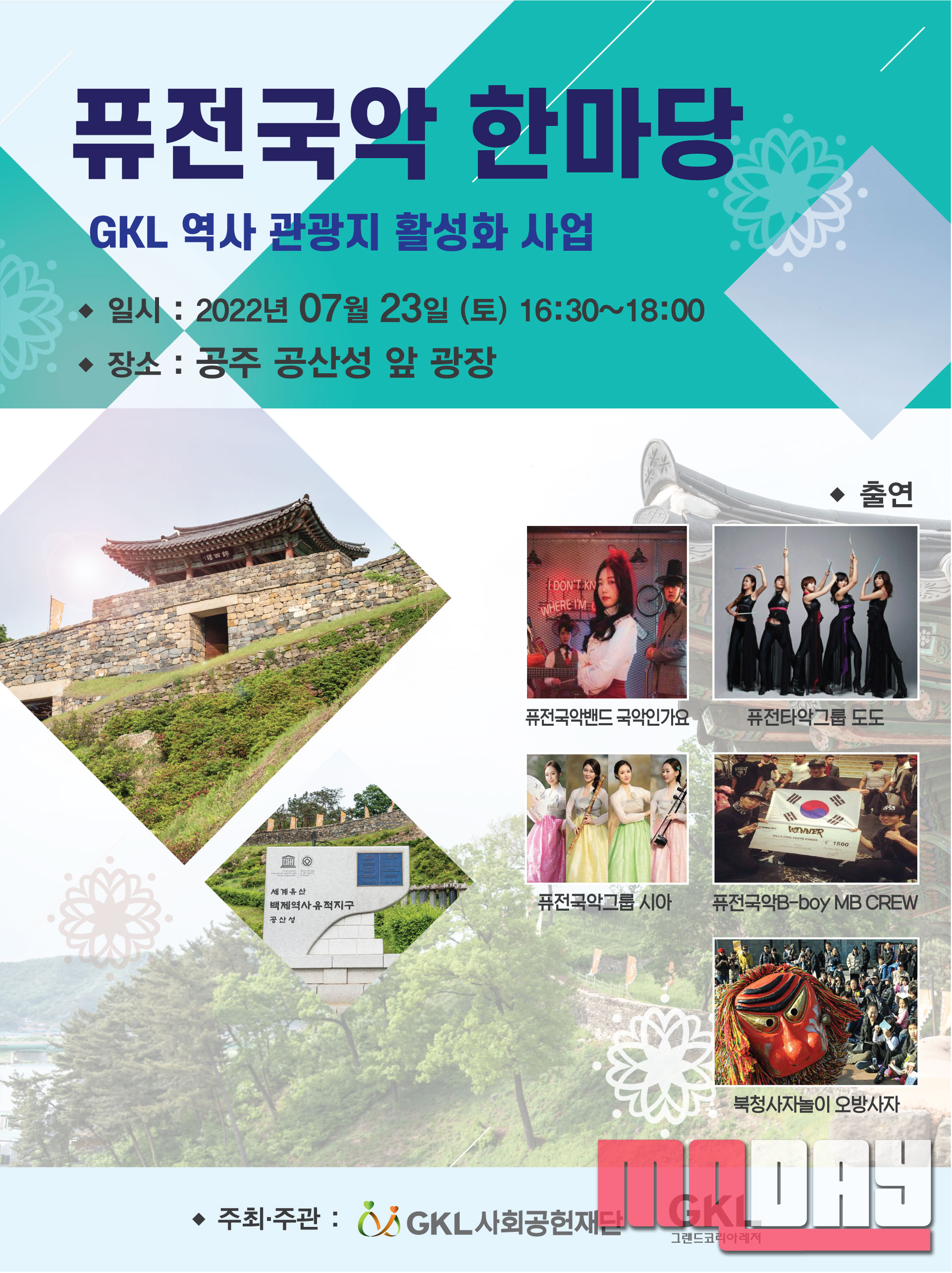 그랜드코리아레저(GKL)와 GKL사회공헌재단은 7월 23일(토) 오후 4시 30분 공주 공산성에서 퓨전국악 한마당을 개최한다.