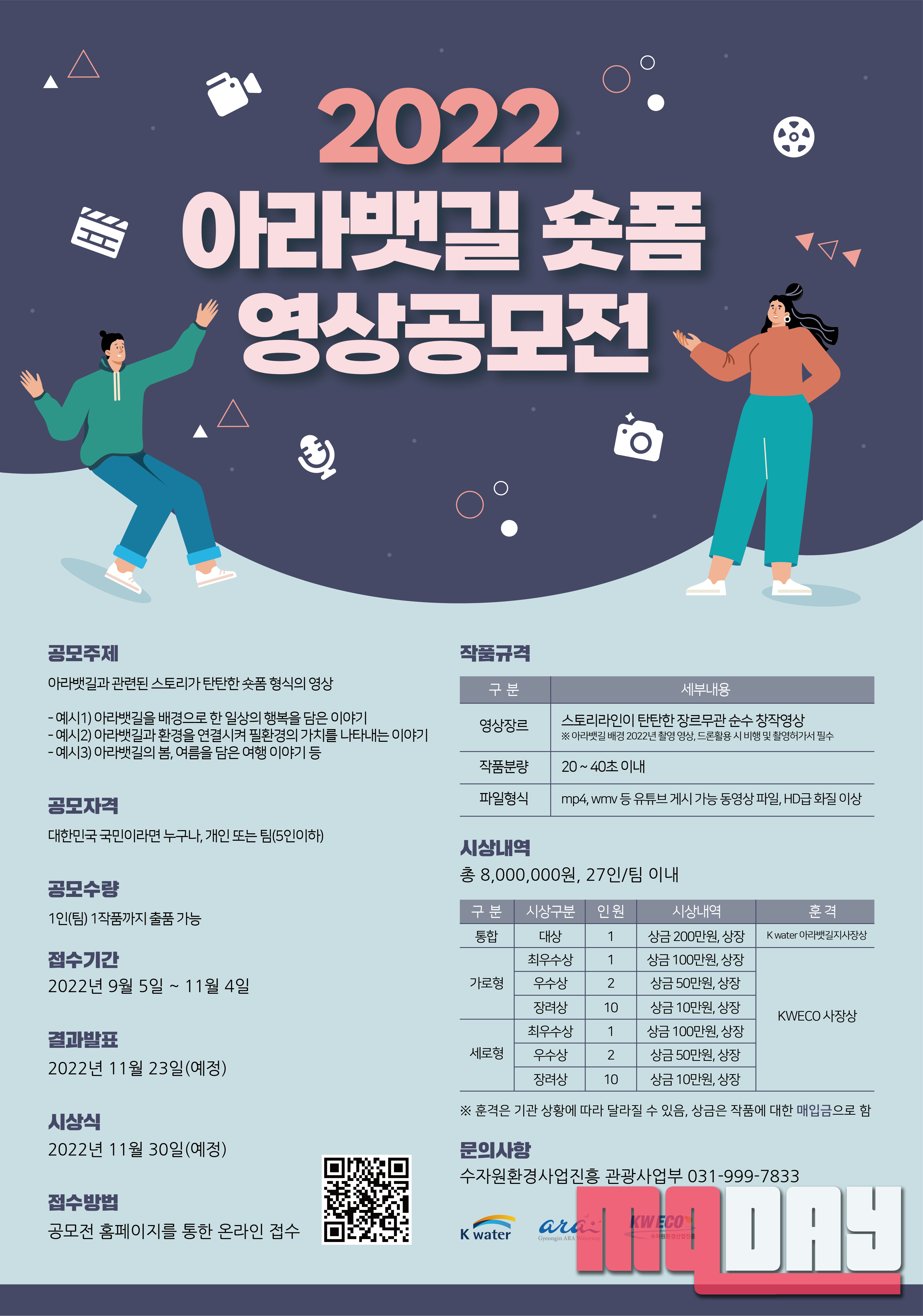 K-water 아라뱃길지사(지사장 김정경)와 수자원환경산업진흥(사장 조중희)은 ‘2022년 아라뱃길 숏폼 영상 공모전’ 작품을 공모한다고 8일 밝혔다.