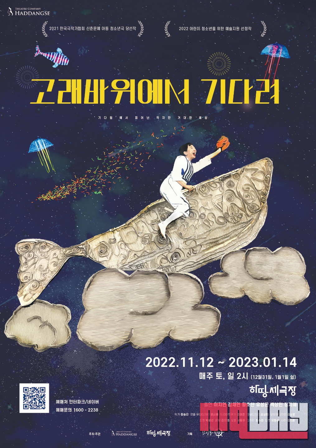 11월 12일부터 1월 14일까지 하땅세 극장에서 공연되는 ‘고래바위에서 기다려’는 만 36개월 이상 관람 연령 가로 코로나19에 지친 가족 관객에게 환상적 영상의 세계로 안내한다.