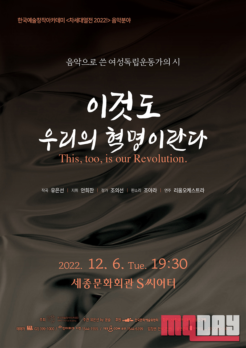 한국예술창작아카데미와 유은선이 주최, 바이윤슬이 주관한 유은선 작곡가의 작곡발표회 ‘이것도 우리의 혁명이란다’가 12월 6일(화) 오후 7시 30분 세종문화회관 S씨어터에서 안희찬 지휘자가 이끄는 리움챔버오케스트라의 연주로 개최된다. 이번 공연은 현대문화가 기획했다.