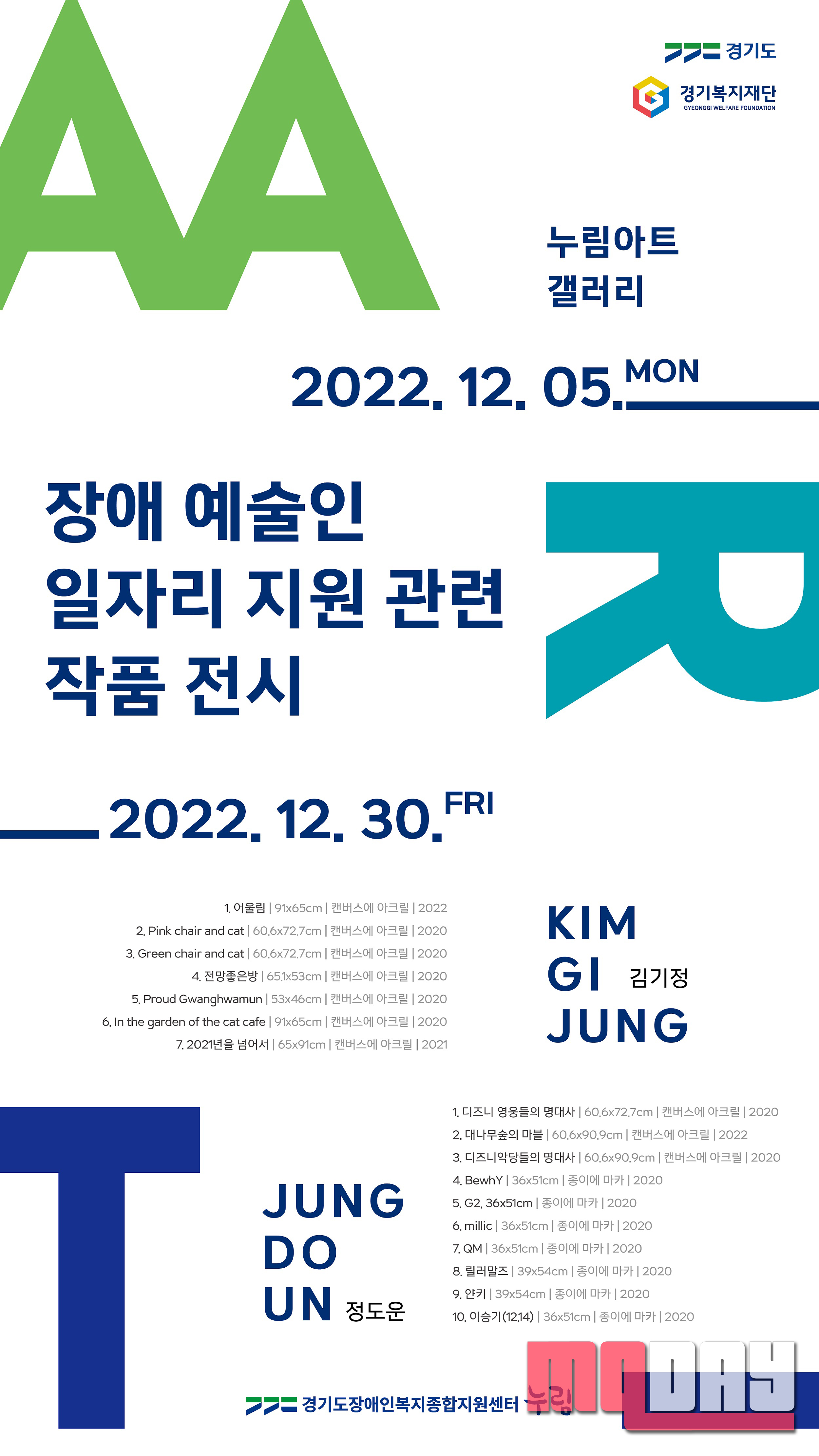 12월 5일부터 12월 30일까지 누림아트 갤러리에서 ‘장애 예술인 일자리 지원 관련 작품 전시’를 관람할 수 있다.