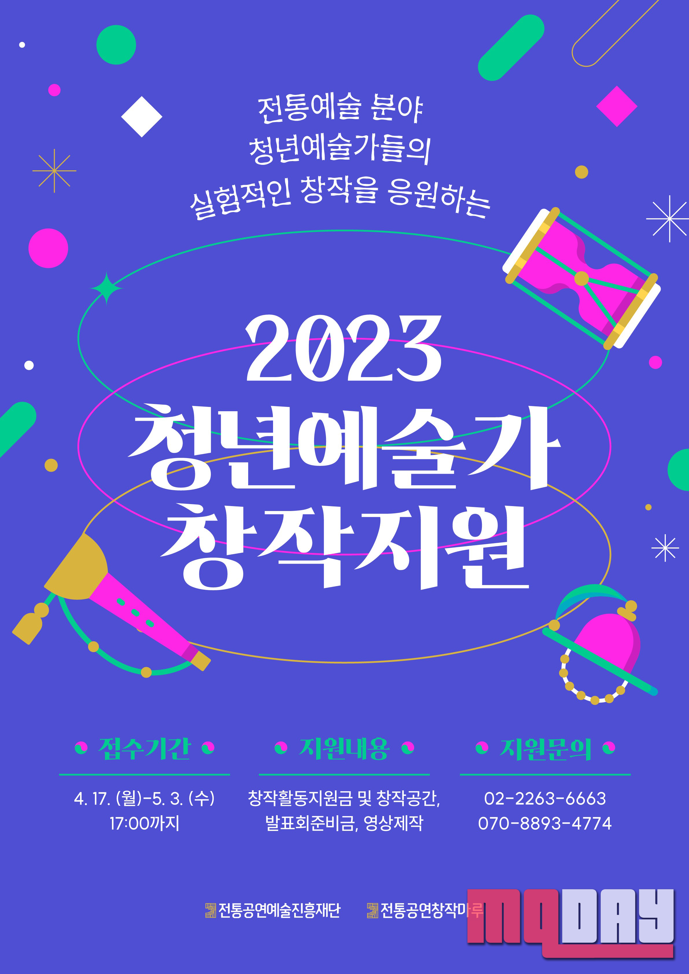 전통공연예술진흥재단(이사장 김삼진)이 전통 분야 청년예술가들의 창작 활동을 지원하는 ‘2023 청년예술가 창작지원’ 공모를 진행한다.