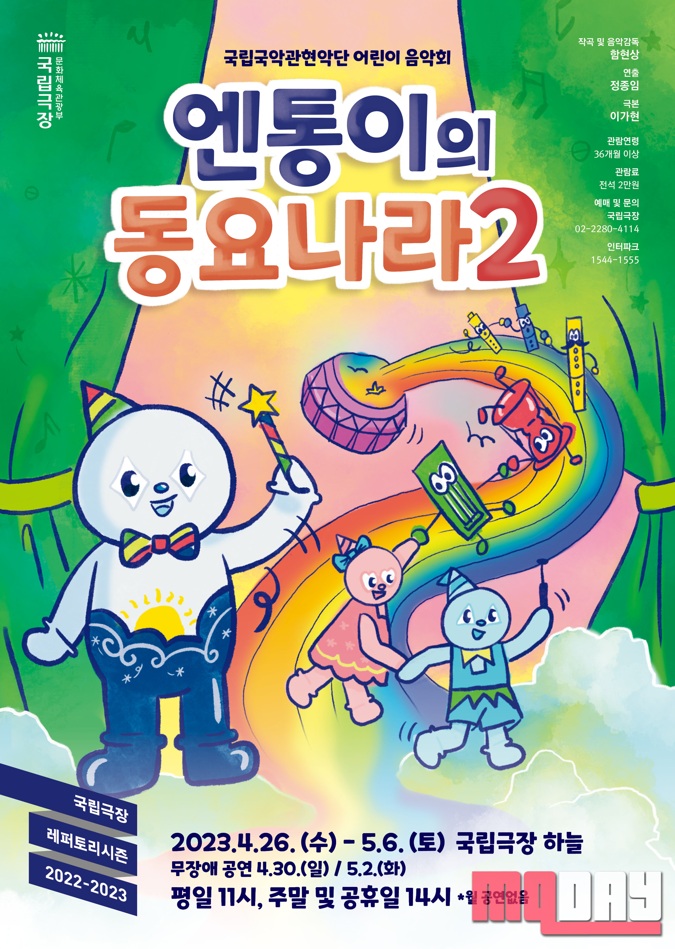 국립극장(극장장 박인건) 전속 단체 국립국악관현악단(예술감독 직무대리 여미순)은 어린이 음악회엔통이의 동요나라2’ 4 26()부터 5 6()까지 하늘극장에서 공연한다.