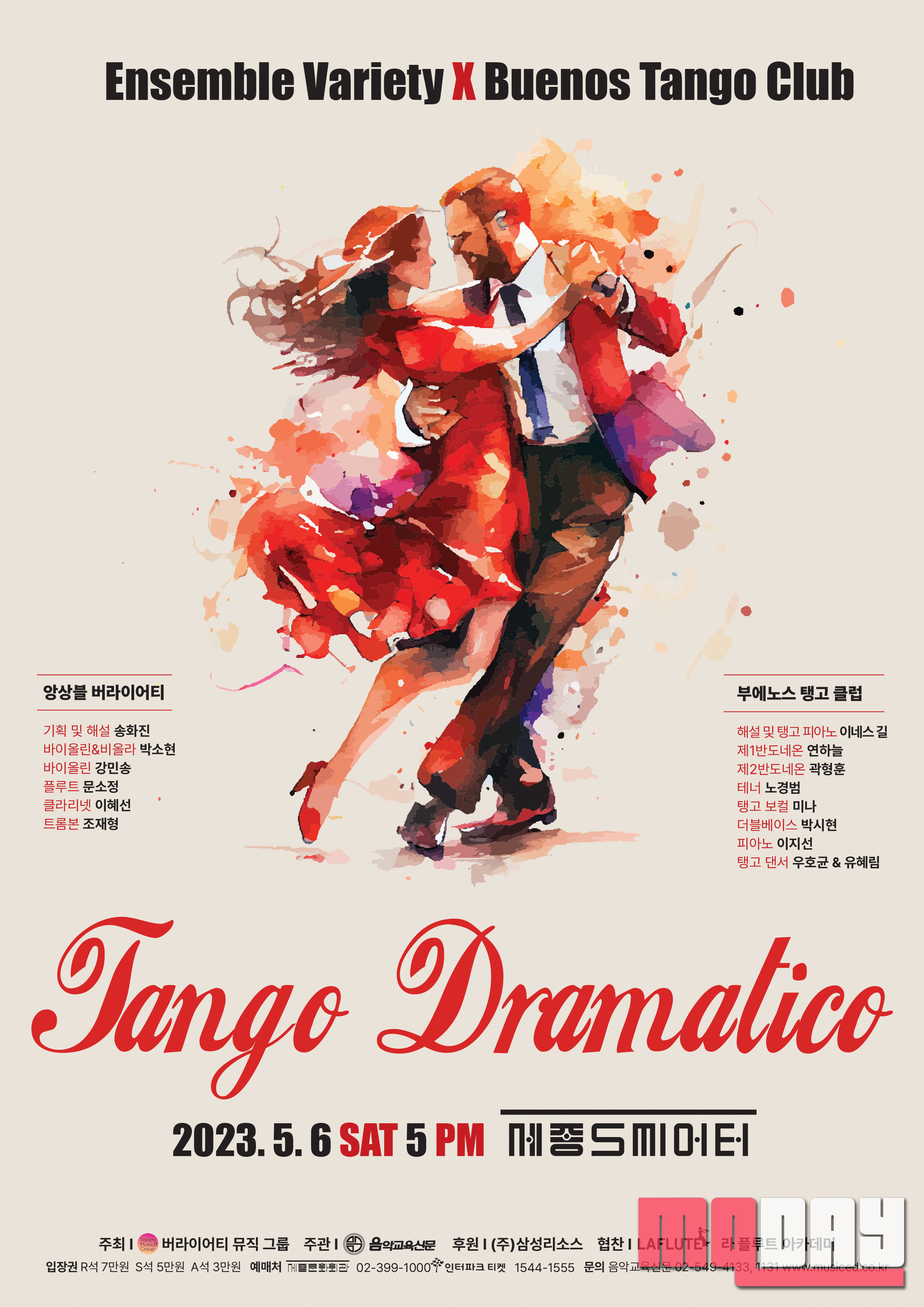 다양성을 모토로 클래식 음악의 정통성을 지켜 나가면서도 관객들에게 클래식의 버라이어티한 매력과 흥미를 안겨주는앙상블 버라이어티가 아르헨티나 전통 탱고 연주팀이자 탱고와 오페라를 결합한탱고페라와 같은 새로운 시도를 지속하는부에노스 탱고 클럽과 함께 컬래버레이션 공연 ‘Tango Dramatico(탱고 드라마티코)’ 5 6일 토요일 오후 5시에 세종문화회관 세종S씨어터에서 선보인다.