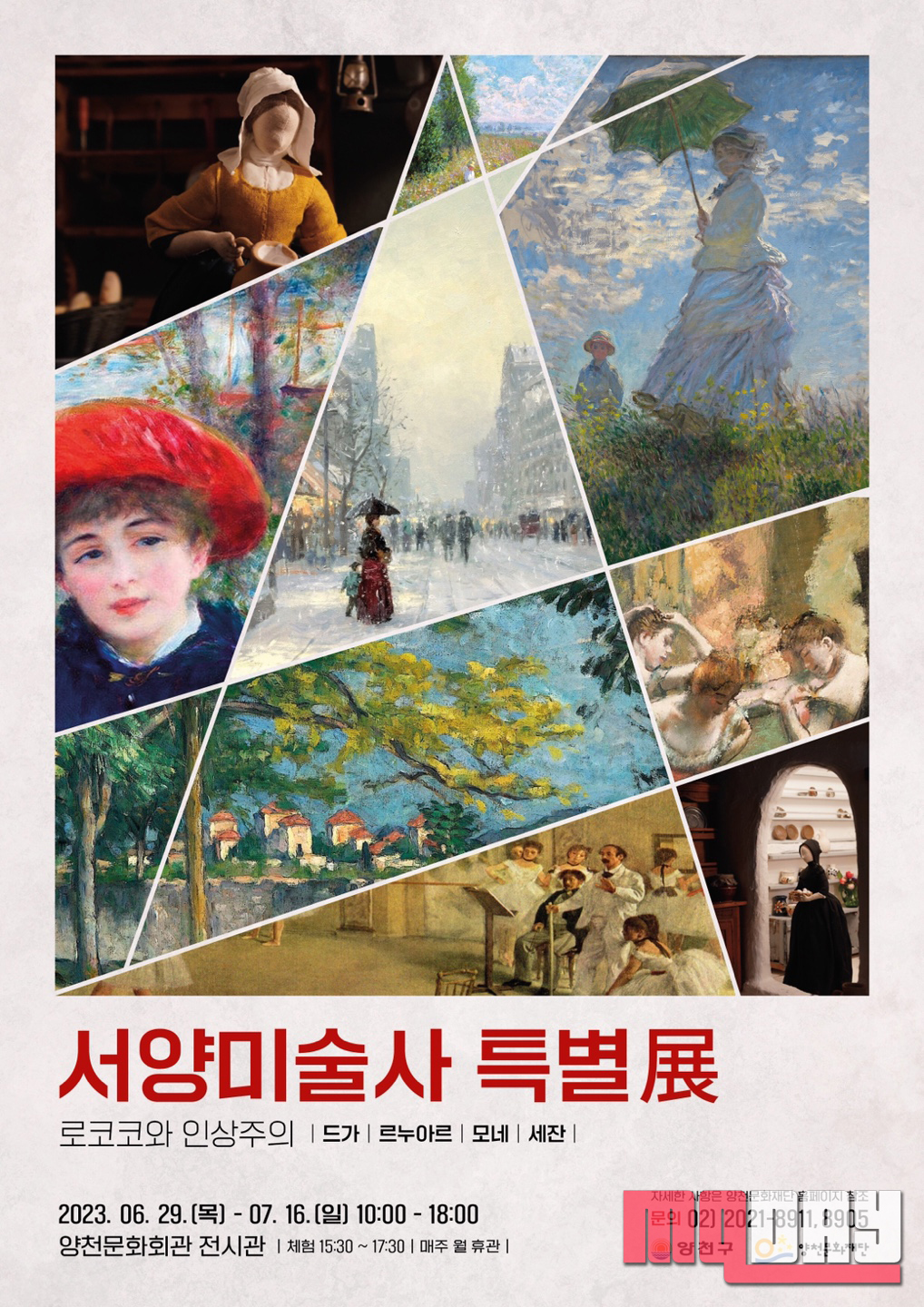 2023 양천문화재단 기획전시 서양미술사 특별전 - 로코코와 인상주의 展은 6월 29일부터 7월 16일까지 양천문화회관 별관 1층 전시관에서 10시부터 18시까지 운영된다. 매주 월요일은 휴관이며, 관람료는 무료다.