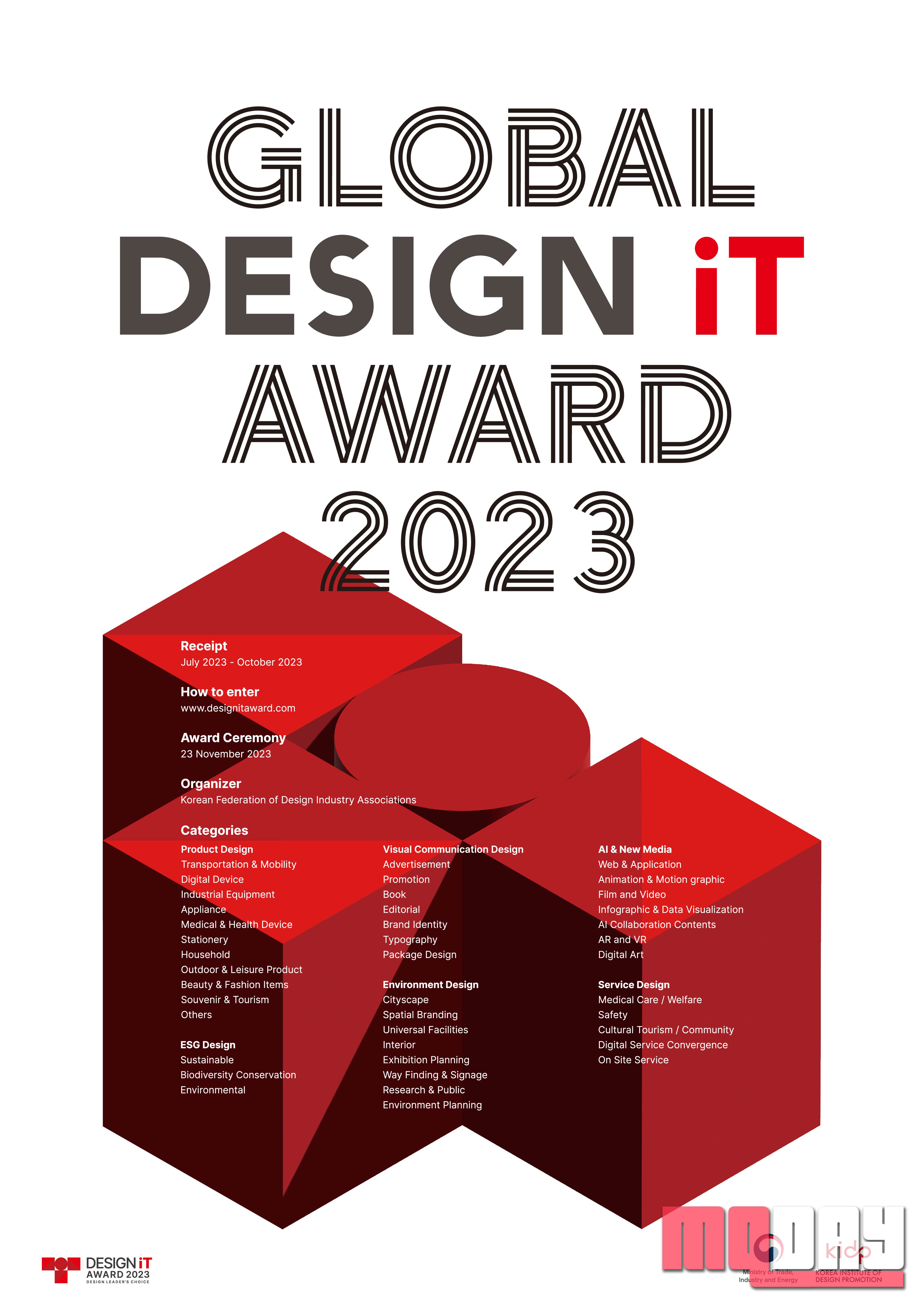 한국디자인산업연합회는 2011년부터 10여 년 동안 대한민국의 수많은 디자이너, 기업, 감독 및 에이전시를 조명한 ‘it Award(잇 어워드)’를 개최해 오고 있다. 특히 지난해부터는 그 범위를 전 세계로 확장, ‘글로벌 디자인 잇어워드’로 전환해 약 25개국의 우수한 해외디자이너의 출품으로 국제적 디자인어워드의 권위를 인정받고 있으며, 한국 디자인 전문기업과 디자이너의 우수성 전파로 K-디자인의 해외 진출에 기여하고 있다.