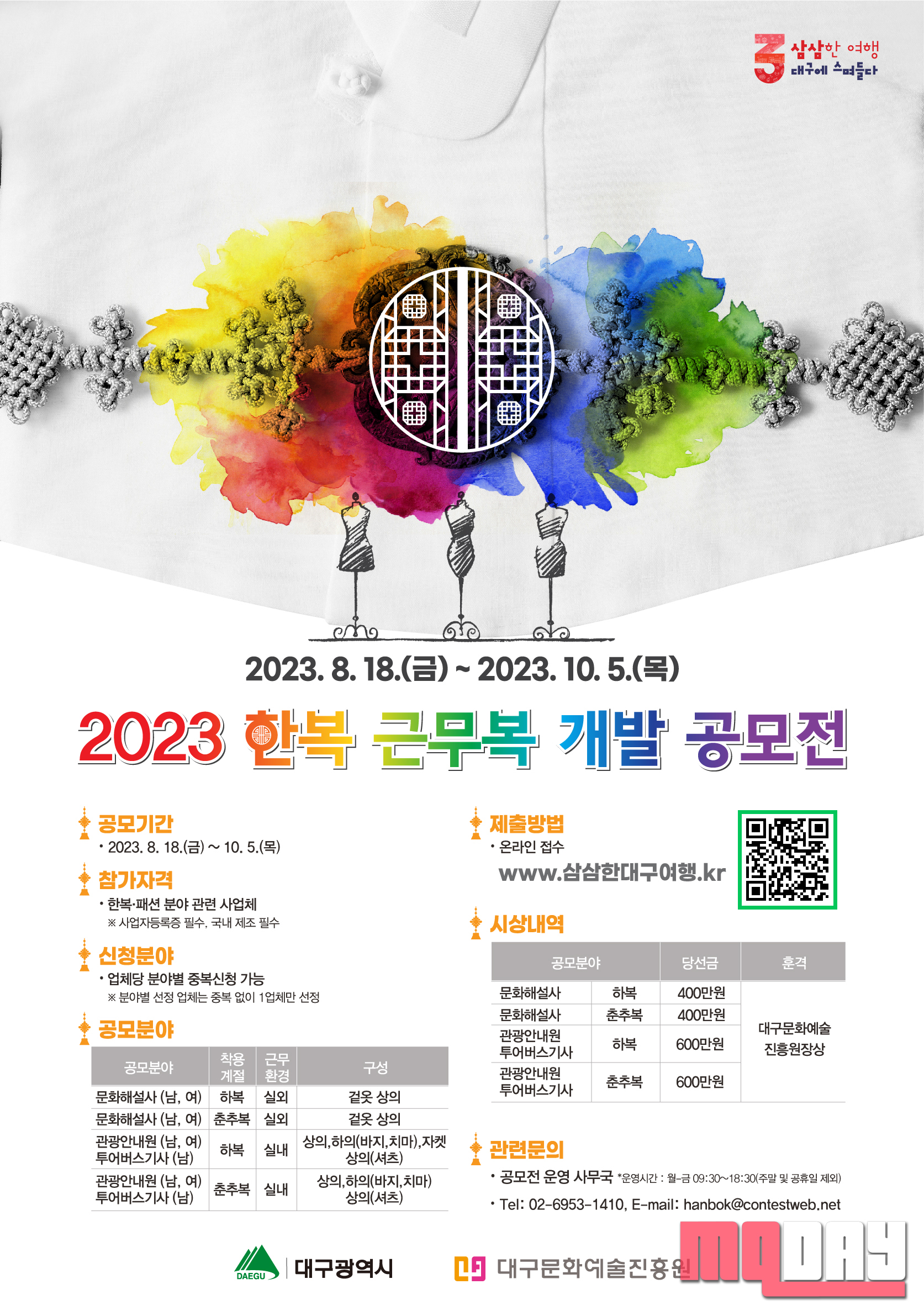 대구광역시와 대구문화예술진흥원(원장 김정길, 이하 진흥원)은 지역의 관광접점 지역에서 관광자원 안내 및 문화해설을 담당하는 실무 종사자의 근무복 개선과 해외 관광객의 환대 강화를 위해 ‘한복 근무복 개발 공모전’을 운영한다고 밝혔다.