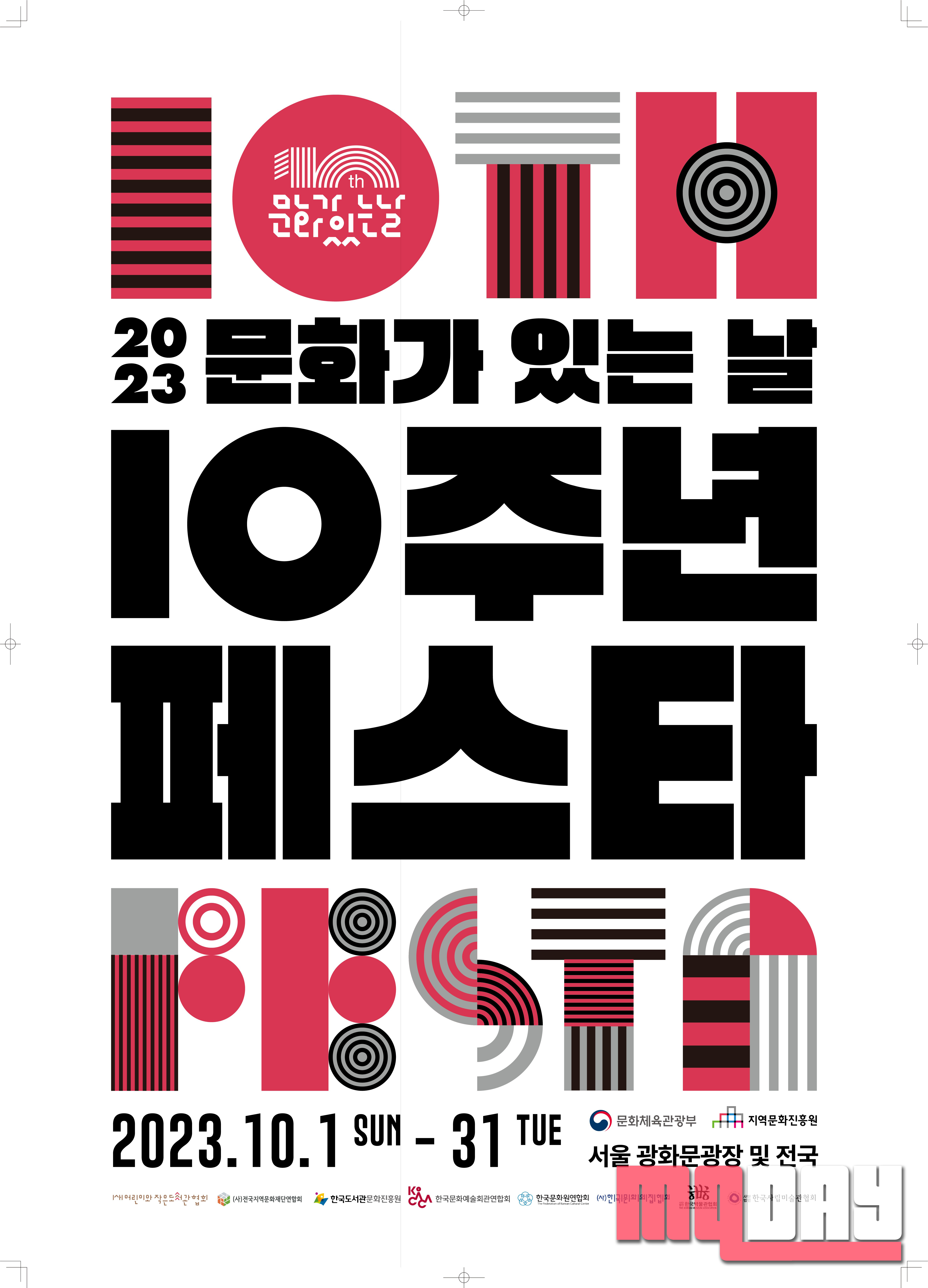 문화체육관광부(장관 박보균, 이하 문체부)가 주최하고 지역문화진흥원(원장 차재근, 이하 진흥원)과 8개 협력기관이 주관·협력하는 ‘2023 문화가 있는 날 10주년 페스타’가 문화의 달인 10월 한 달간(10.1.~31.) 서울 광화문광장 일대 및 전국 각지에서 개최된다.