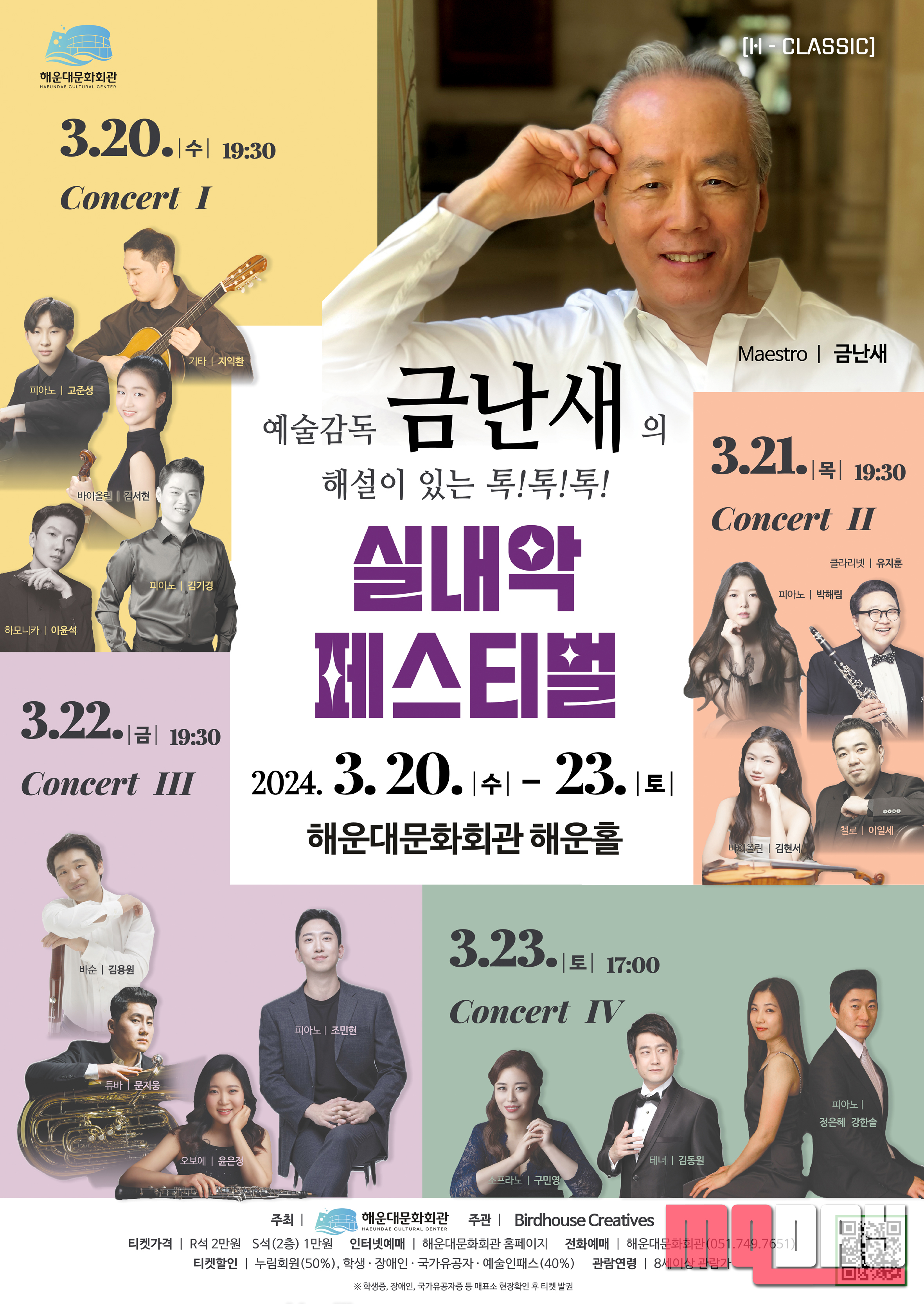 해운대문화회관(관장 전정희)은 오는 3 20()부터 23()까지 4일간 해운대문화회관 해운홀에서 ‘H-클래식 - 금난새의 해설이 있는 톡!!!(talk) 실내악 페스티벌을 무대에 올린다.
