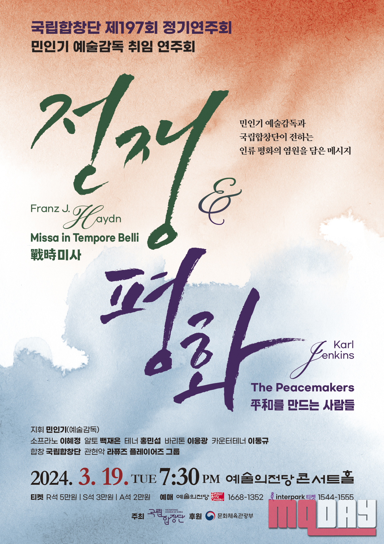 국립합창단(단장 겸 예술감독 민인기)은 2024년 3월 19일(화) 오후 7시 30분 예술의전당 콘서트홀에서 제197회 정기연주회 민인기 취임 연주회 <전쟁 그리고 평화>를 개최한다. 이번 정기연주회는 국립합창단의 제12대 단장 겸 예술감독으로 취임한 민인기의 첫 번째 정기연주회로, 고전 음악의 거장 하이든(Franz J. Haydn)의 ‘전시 미사(Missa in Tempore Belli)’와 영국의 현대 음악가 칼 젠킨스(Karl Jenkins)의 ‘평화를 만드는 사람들(The Peacemakers)’을 선보인다.