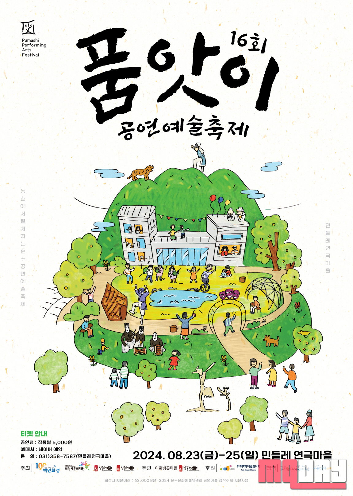 화성시문화재단(대표이사 김신아)은 오는 8월23일부터 25일까지 총 3일간 화성시 우정읍 이화리 민들레연극마을에서 극단 민들레와 함께 화성시 서·남부권을 대표하는 ‘제16회 품앗이 공연예술축제’(이하 품앗이 축제)를 개최한다.