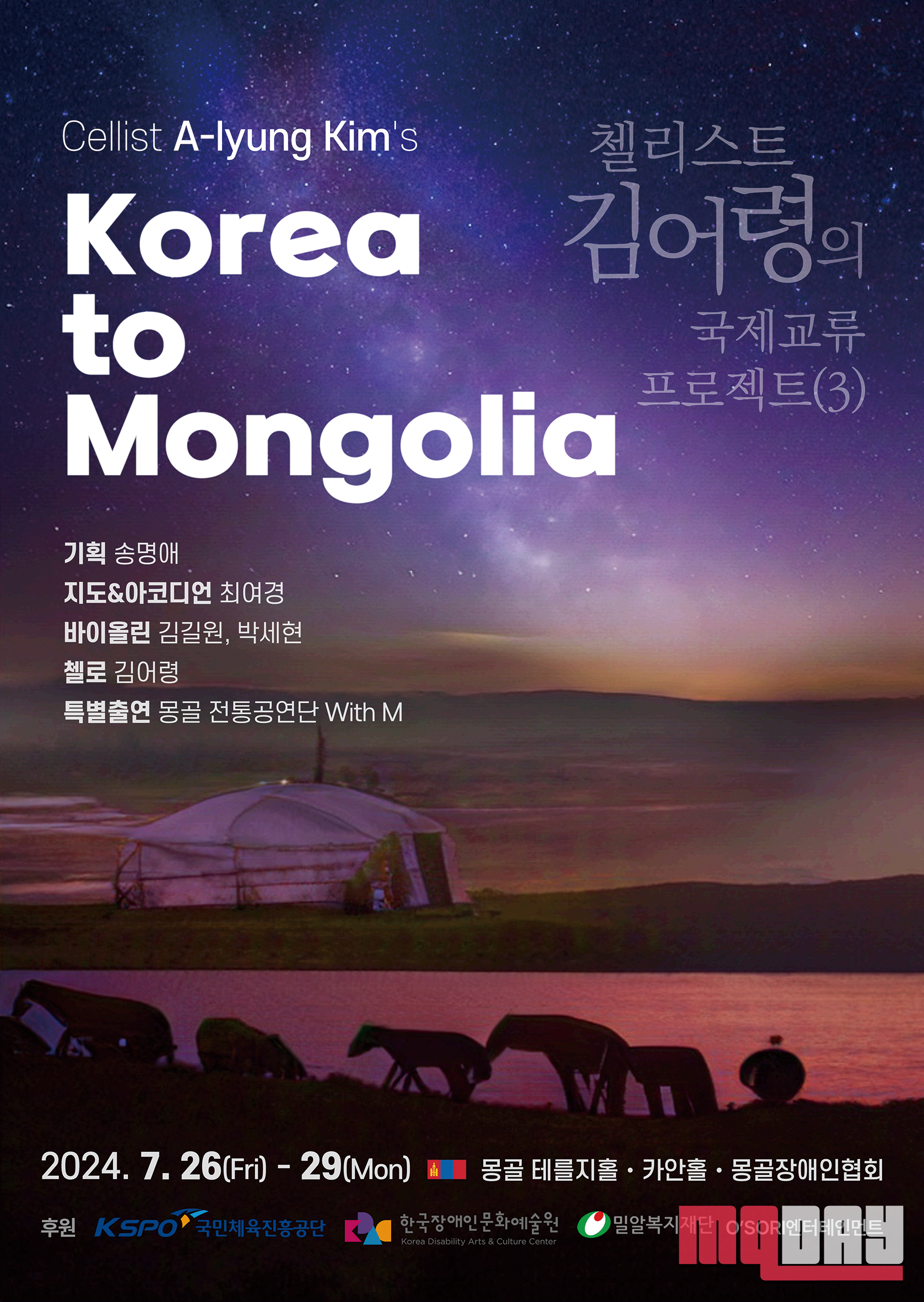 장애와 비장애의 경계를 허물고 다양한 예술활동을 펼치고 있는 지적장애 첼리스트 김어령이 몽골 예술인과의 국제교류 프로젝트인 ‘Korea to Mongolia’를 성료했다고 7일 밝혔다.