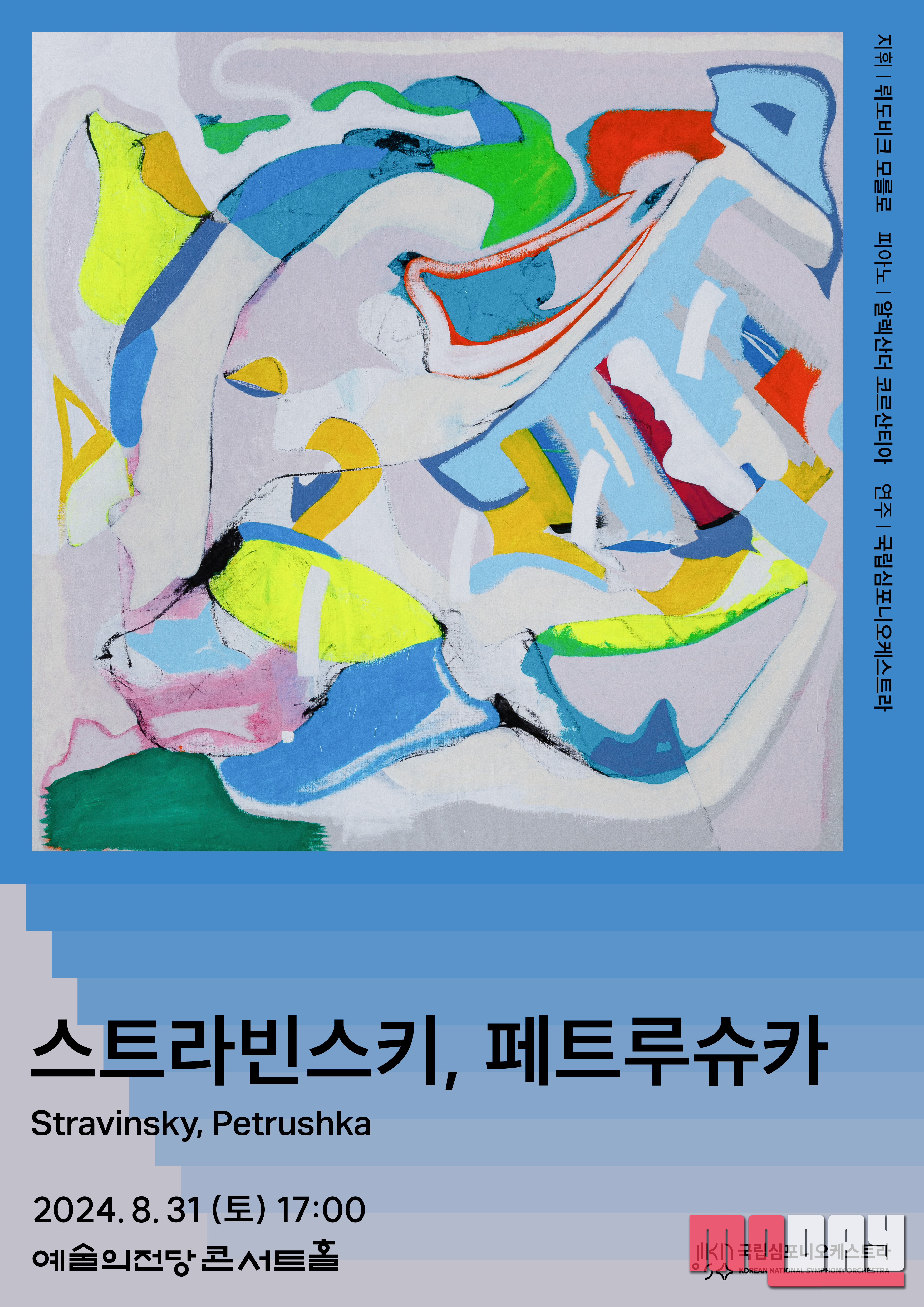 또한 국립심포니는 클래식 음악의 새로운 감상 지평을 열고자 미술작가와의 협업을 진행하고 있다. 이번 포스터 작업에는 마이큐(My Q)가 참여했다. 200곡이 넘는 작품을 발표한 싱어송라이터이자 화가이다. 발레 원작인 ‘페트루슈카’ 속 다채로운 리듬과 선율을 캔버스 색과 선으로 담아내 ‘상상 속 발레리나’를 통한 작품의 ‘자유로움’을 이야기한다.
