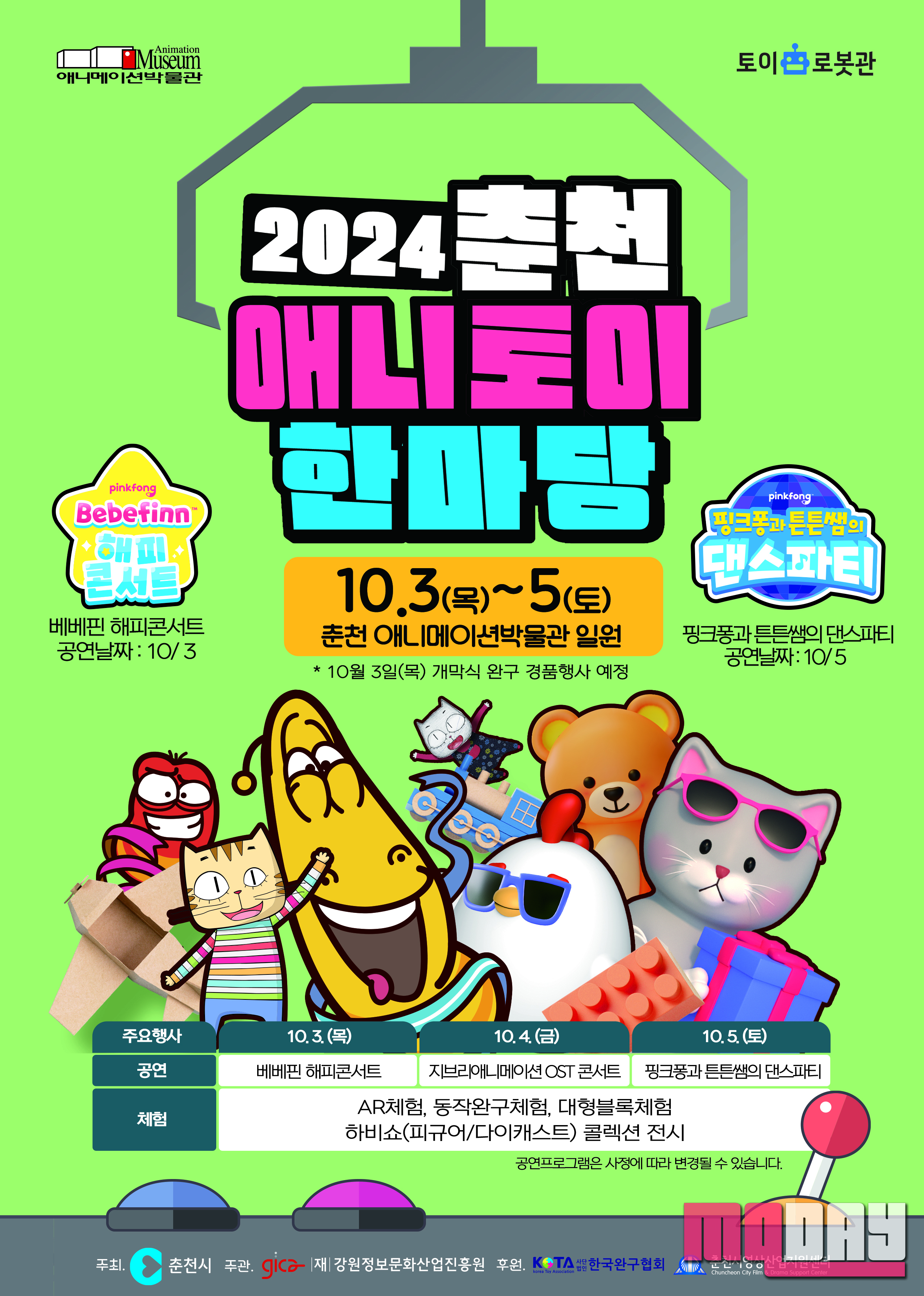 강원정보문화산업진흥원(원장 서병조)은 오는 10월3일(목)부터 5일(토)까지 3일간 춘천 애니메이션박물관 일원에서 ‘2024년 춘천 애니·토이 한마당’ 축제를 개최한다고 밝혔다.