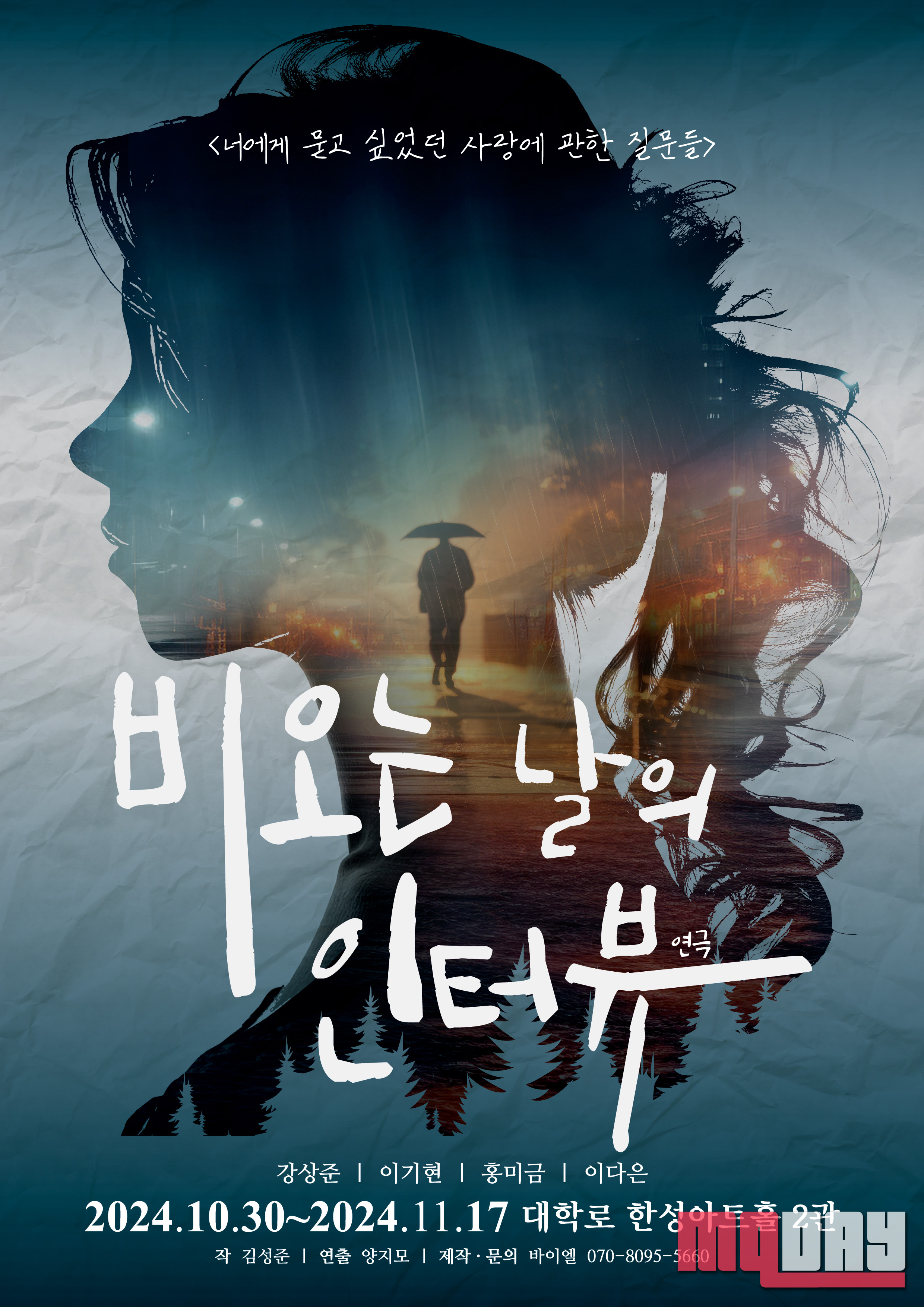 진정한 사랑의 의미와 연인과의 관계에 있어 가장 중요한 것이 무엇인지를 냉철하게 묻고 있는 연극 ‘비 오는 날의 인터뷰’는 오는 10월30일부터 11월17일까지 서울 종로구 대학로 한성아트홀 2관에서 만나볼 수 있다.
