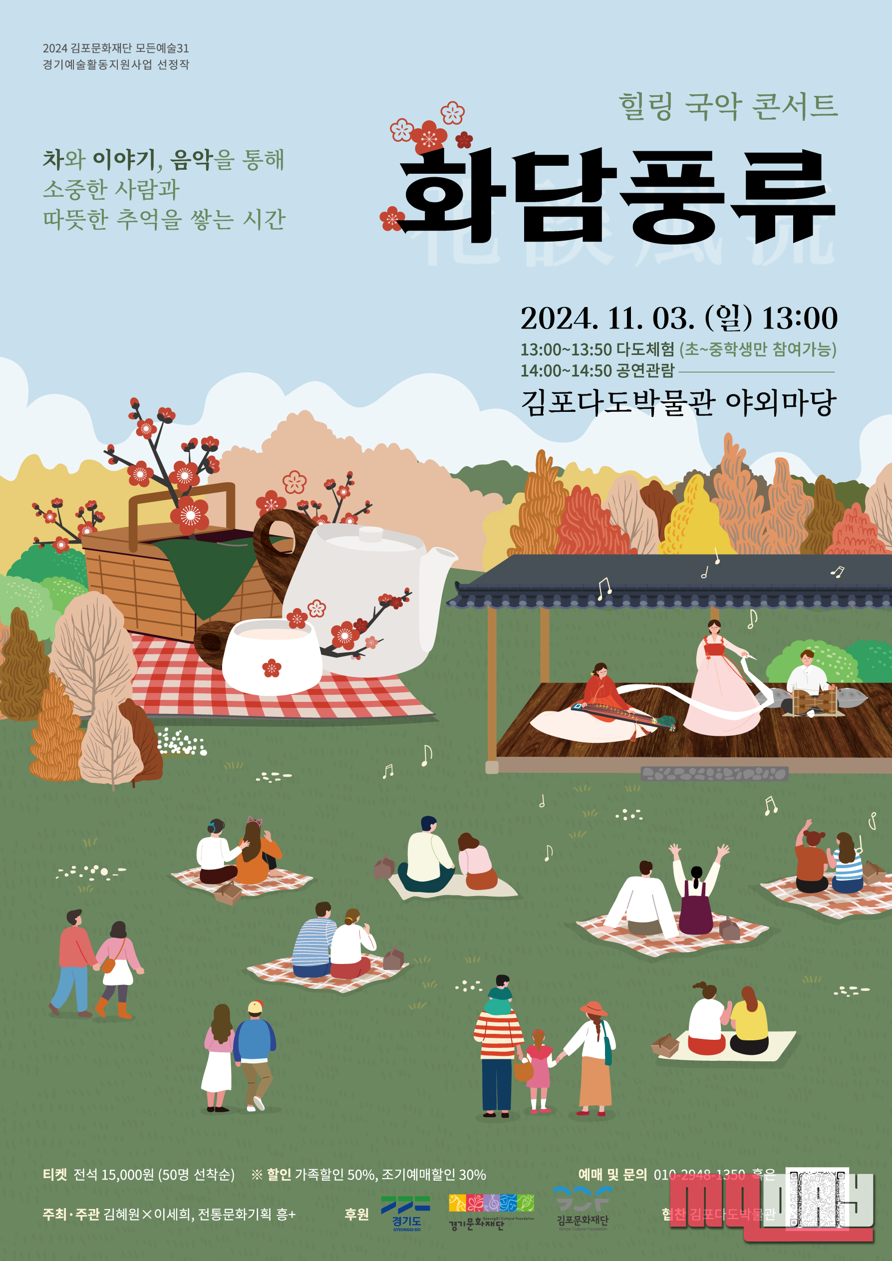 특히 이날 공연에는 1만원 상당의 김포다도박물관의 ‘차 피크닉세트’를 공연의 주제 매화와 연계해 평소에는 맛볼 수 없었던 특별한 구성으로 공연 관람객 모두에게 제공할 예정이며, 초등학생 이상 중학생 이하 선착순 20명에 한해 김포다도박물관에서 진행하는 ‘다도 체험’ 행사에 무료로 참여할 기회가 주어진다.