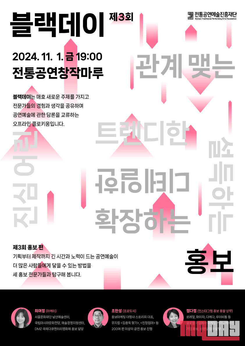 11월 1일 열리는 제3회 ‘공진단 블랙데이’의 주제는 ‘홍보’이다. 무형의 공연예술을 어떻게 브랜딩하고 상품으로서의 가치를 발현시킬 수 있을지, 특히 저예산, 소규모 공연의 홍보 전략을 어떻게 세우고 실행해야 할지 세 명의 홍보 전문가들의 경험과 사례를 소개한다.
