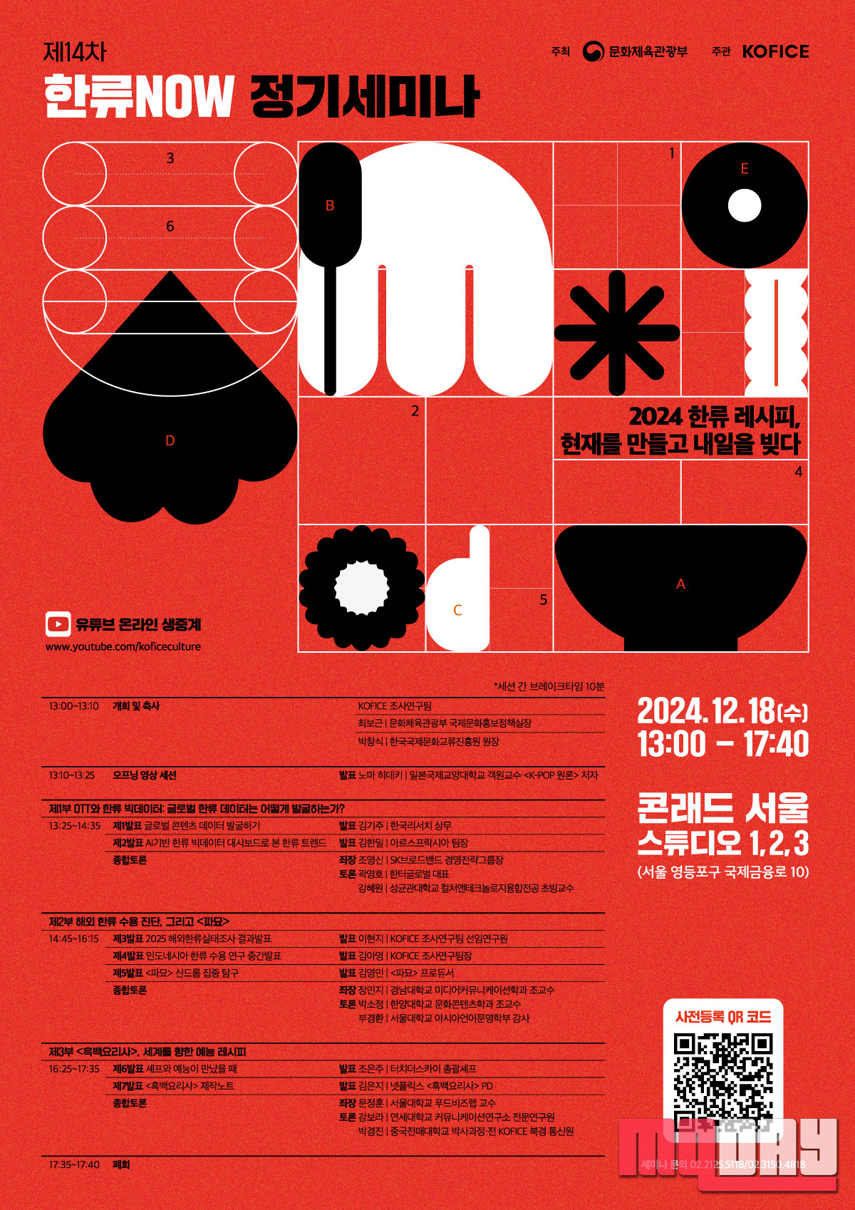 문화체육관광부(장관 유인촌)가 후원하고 한국국제문화교류진흥원(원장 박창식, 이하 진흥원)이 주관하는14차 한류NOW 정기 세미나 ‘2024 한류 레시피, 현재를 만들고 내일을 빚다라는 주제 아래 오는 1218일 낮 1시부터 서울 여의도 콘래드서울 스튜디오 1, 2, 3에서 열린다.