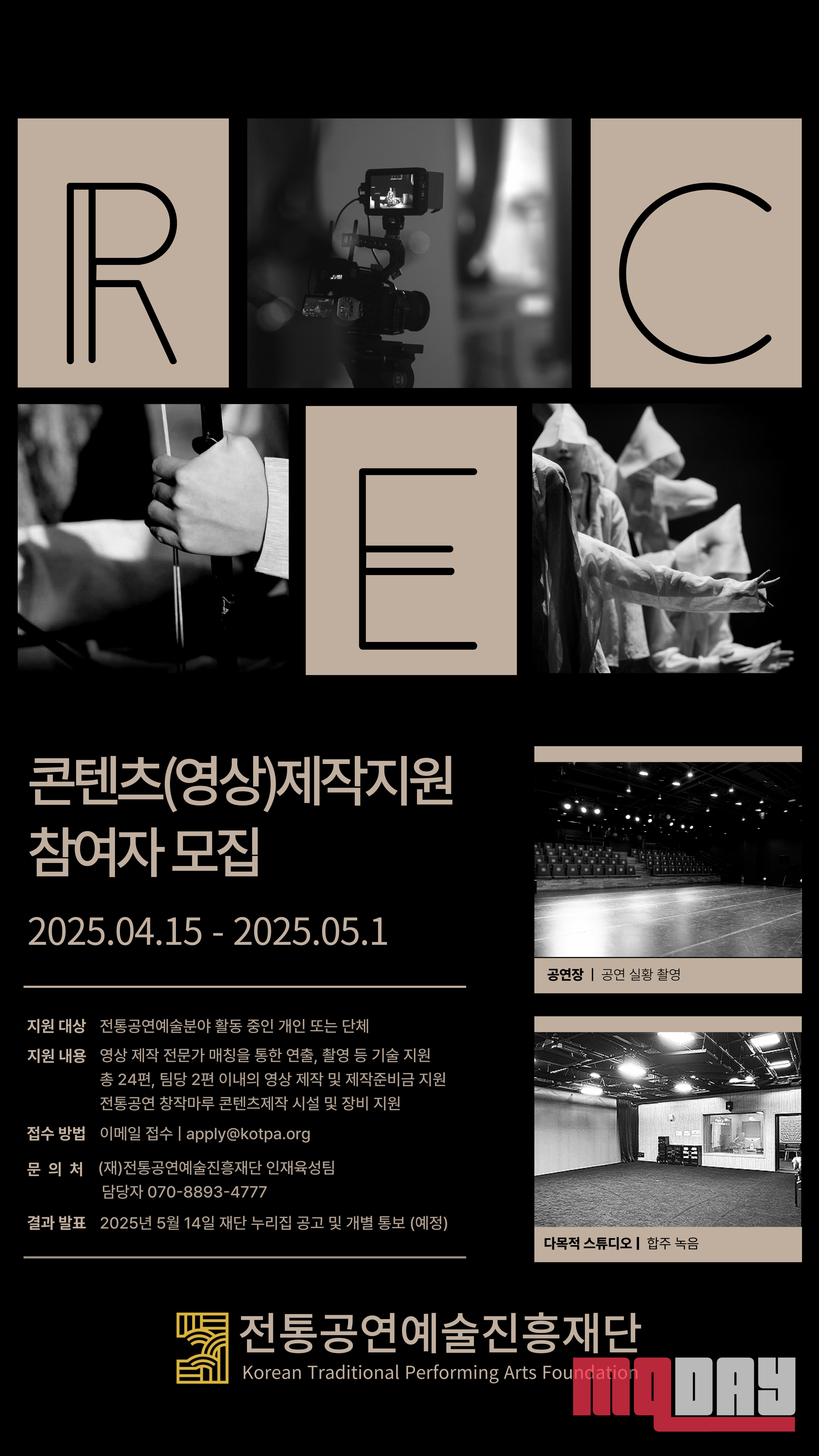 전통공연예술진흥재단(이사장 배영호)은 콘텐츠 제작 비용 문제로 어려움을 겪고 있는 전통예술 분야 예술인들을 지원하는 ‘2025 전통공연 예술 콘텐츠(음원/영상) 제작 지원’ 참여자 공모를 진행한다.
