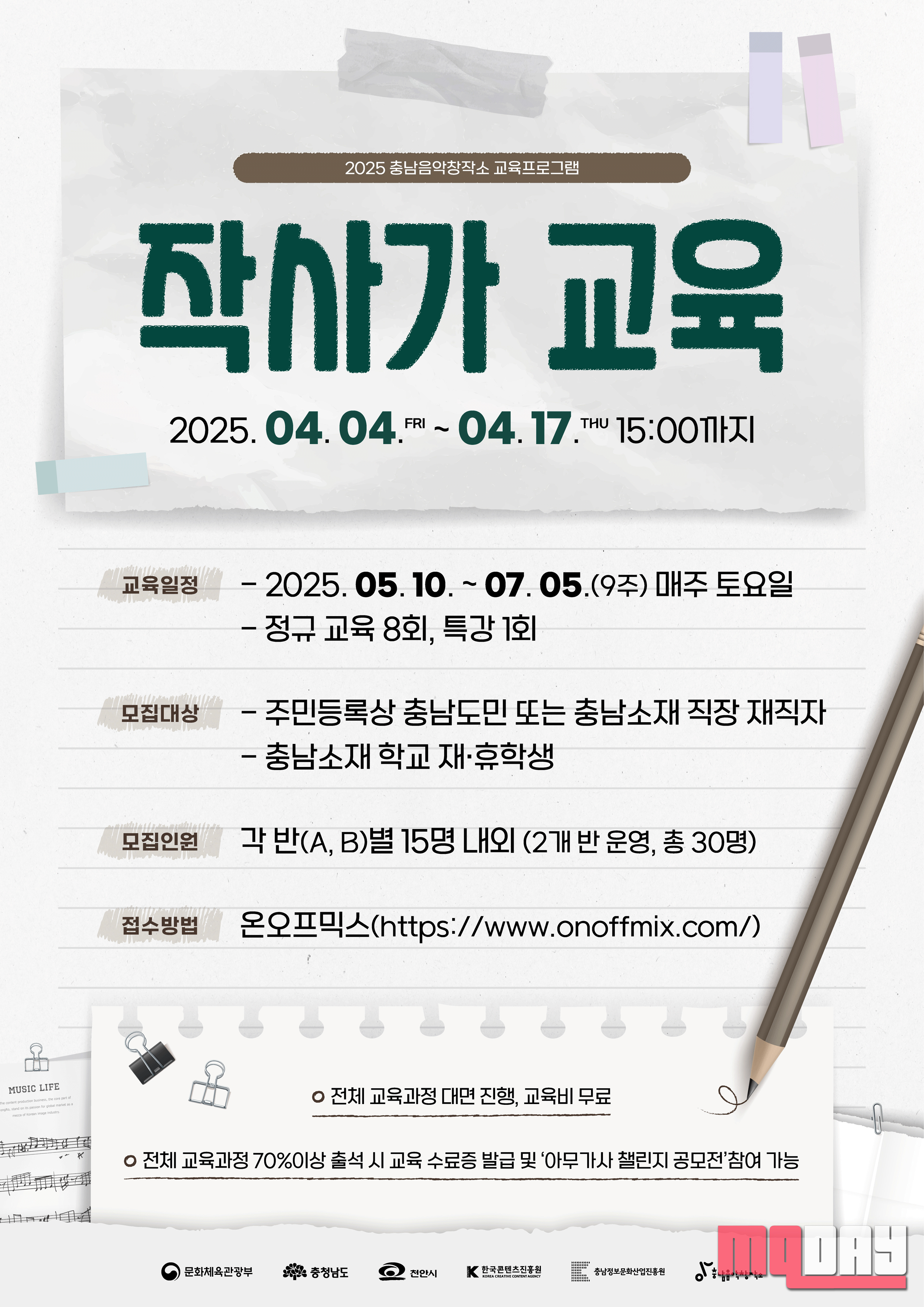 충남정보문화산업진흥원(원장 김곡미)은 지역 대중음악산업 활성화를 목적으로 ‘2025년도 작사가 교육 프로그램’의 교육생을 오는 4월7일부터 모집한다고 밝혔다.