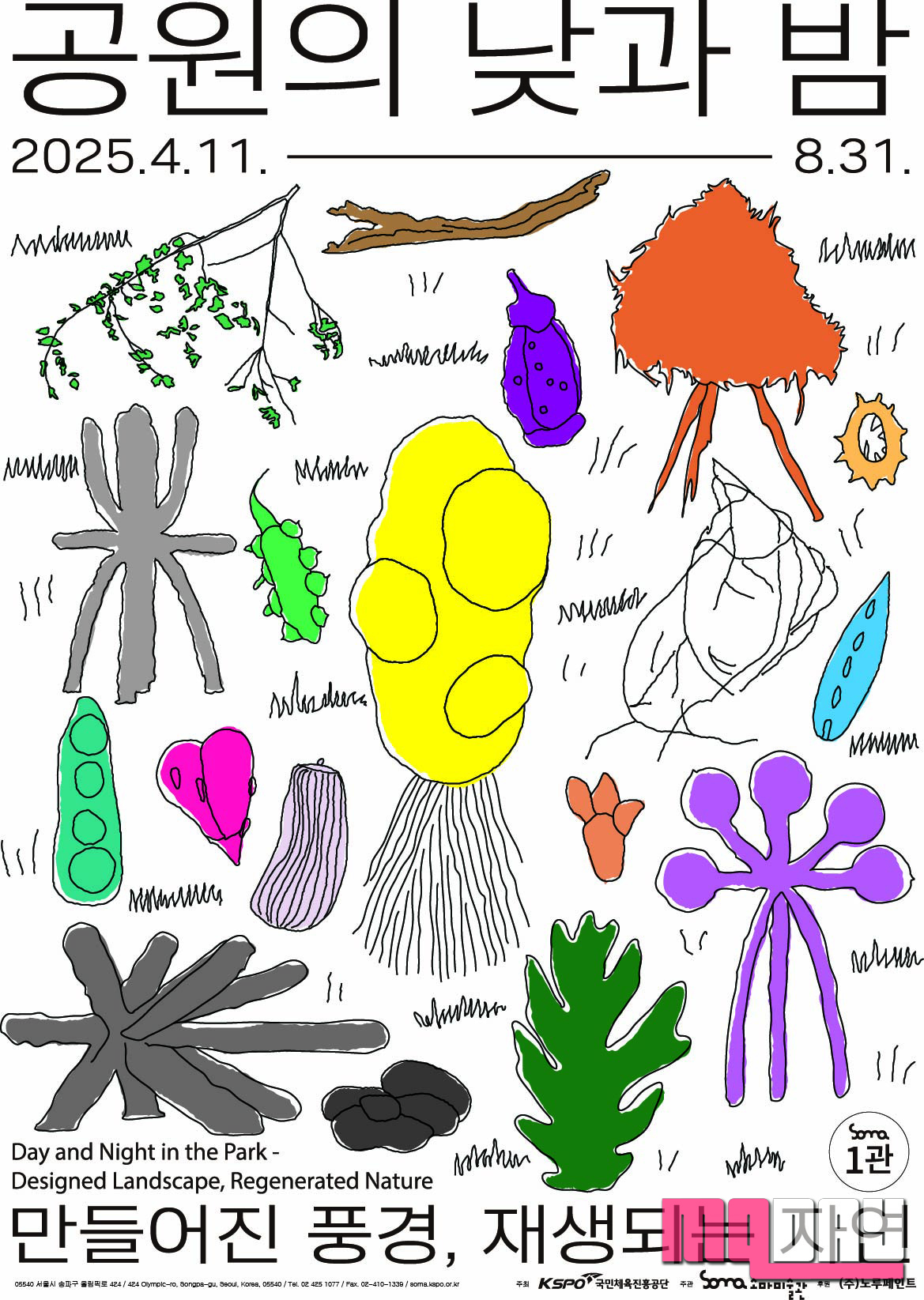 국민체육진흥공단(이사장 하형주) 소마미술관(관장 차차남)은 2025년 4월11일부터 8월31일까지 ‘공원의 낮과 밤 - 만들어진 풍경, 재생되는 자연’전을 개최한다. 이 전시는 소마미술관 최초 올림픽공원의 생태적 환경을 주제로 한 전시로, 강현아, 권다예, 나점수, 박문희, 소수빈, 송미리내, 정재희, 홍이카 8명의 드로잉, 회화, 입체, 사진, 영상 등 200여점을 선보인다.