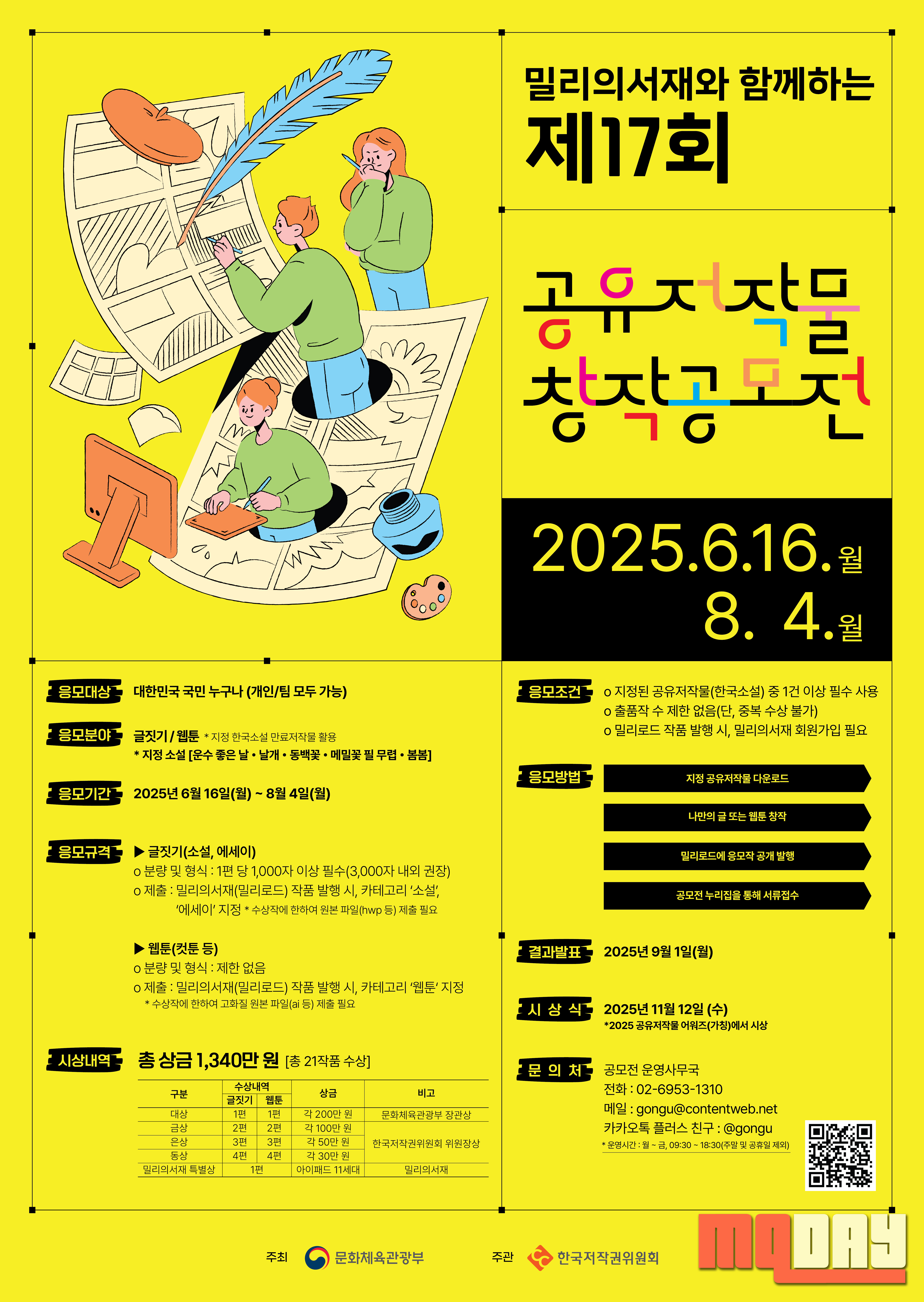 문화체육관광부(장관 유인촌, 이하 문체부)와 한국저작권위원회(위원장 강석원, 이하 위원회)는 국내 최대 도서 플랫폼 케이티(KT) 밀리의서재(대표이사 박현진)와 함께 ‘제17회 공유저작물 창작공모전’을 6월16일(월)부터 8월4일(월)까지 개최한다고 밝혔다.